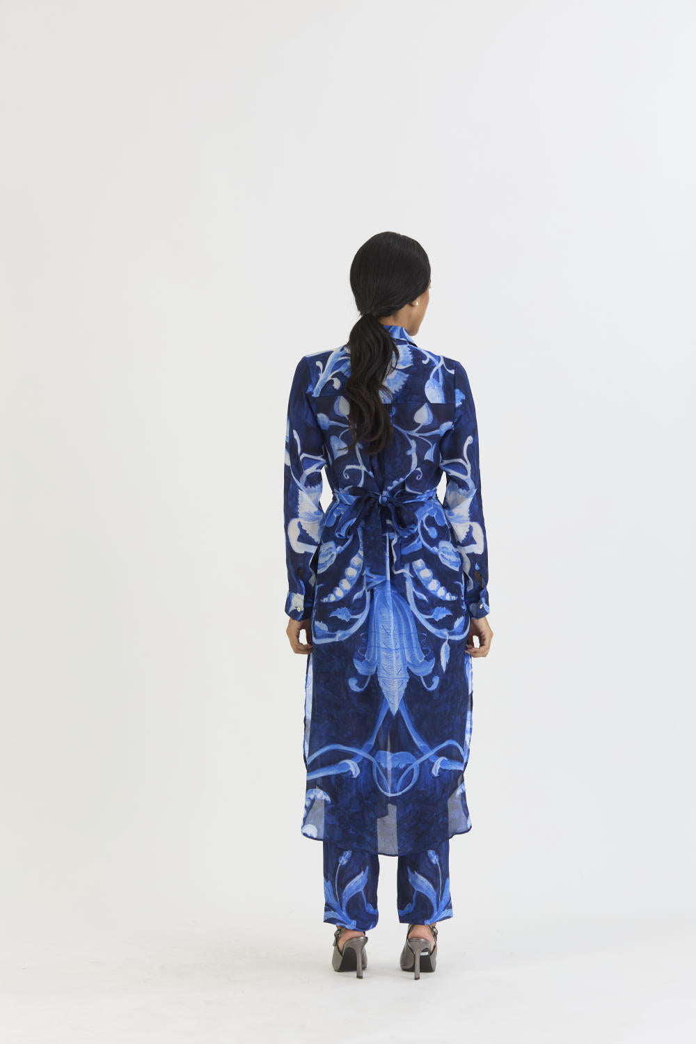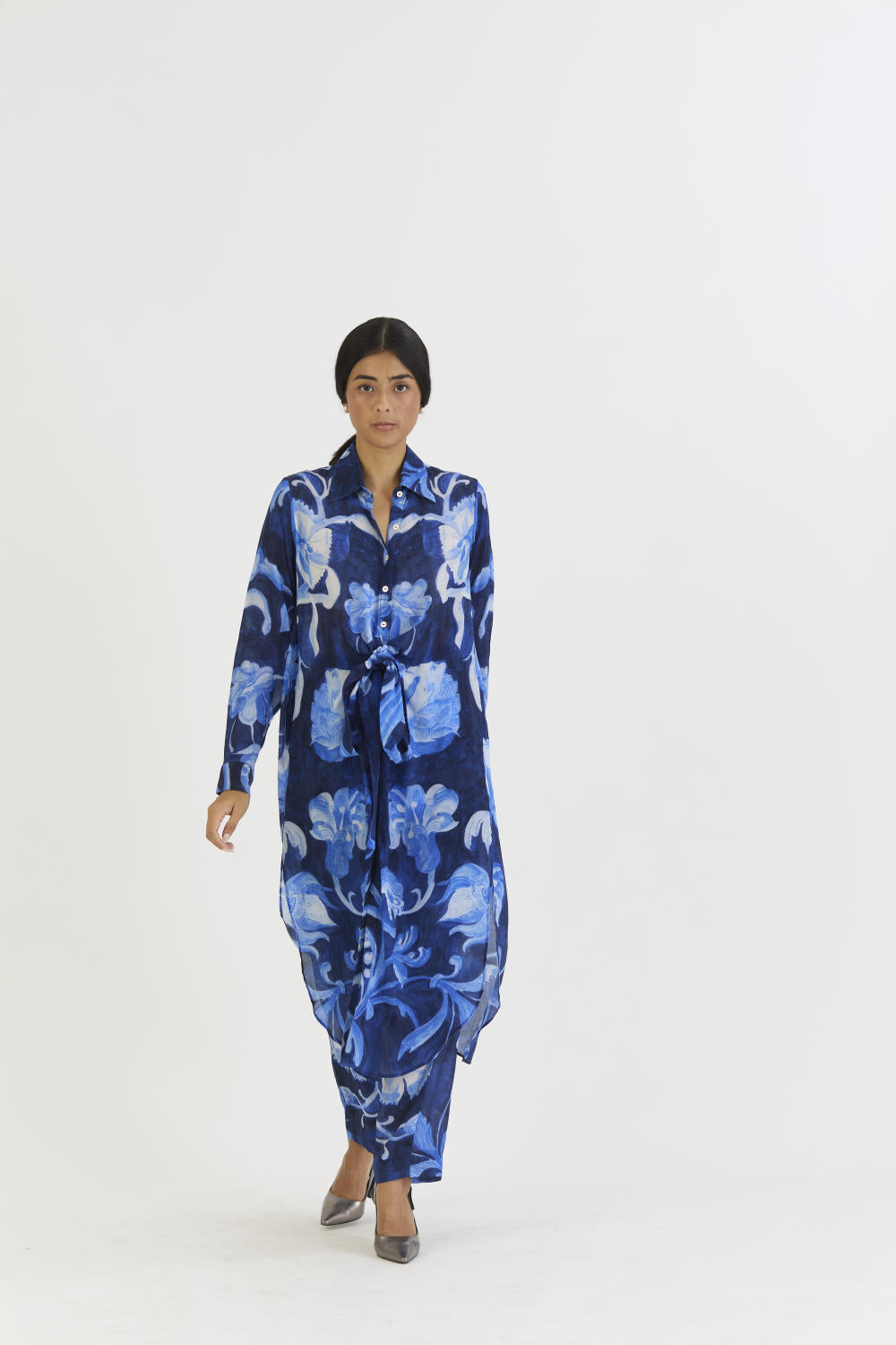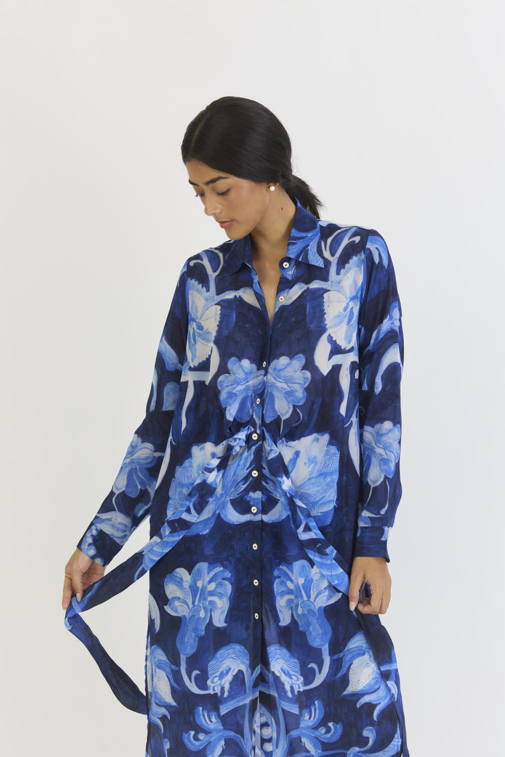 The shirt collar and button-down design of the kurta with a wrap detail