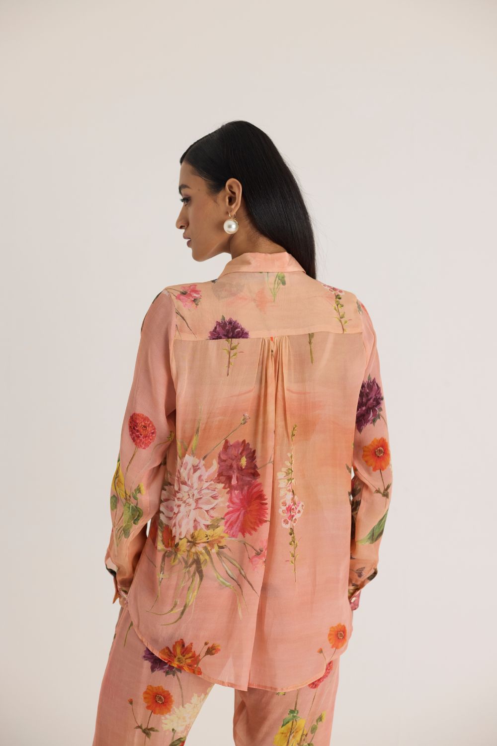 Elevate your wardrobe with this effortlessly chic floral-printed ensemble, exuding timeless elegance. The warm peach-toned base is adorned with an exquisite botanical print featuring an array of delicate blossoms in vibrant hues. This soft yet striking design captures the essence of a serene garden, making it perfect for both daytime sophistication and evening charm.