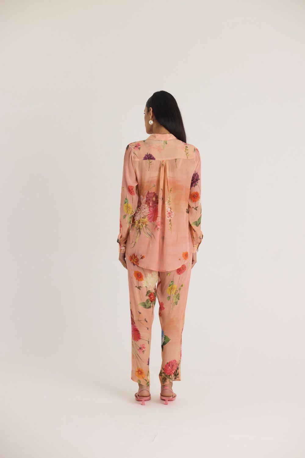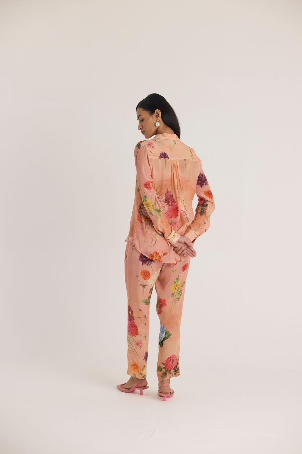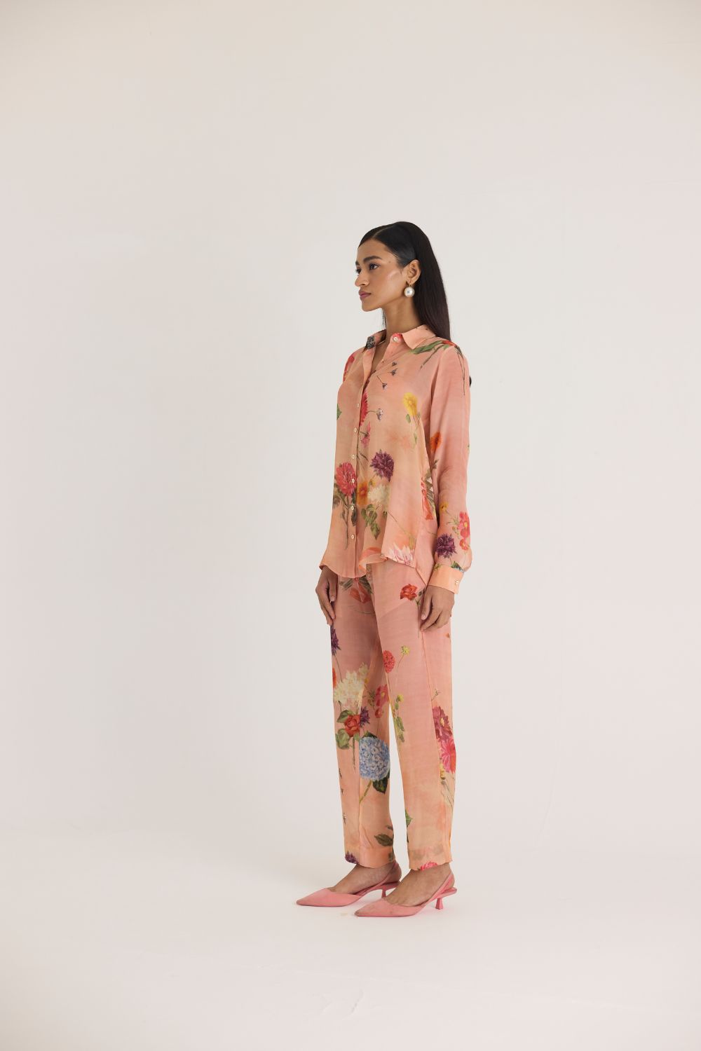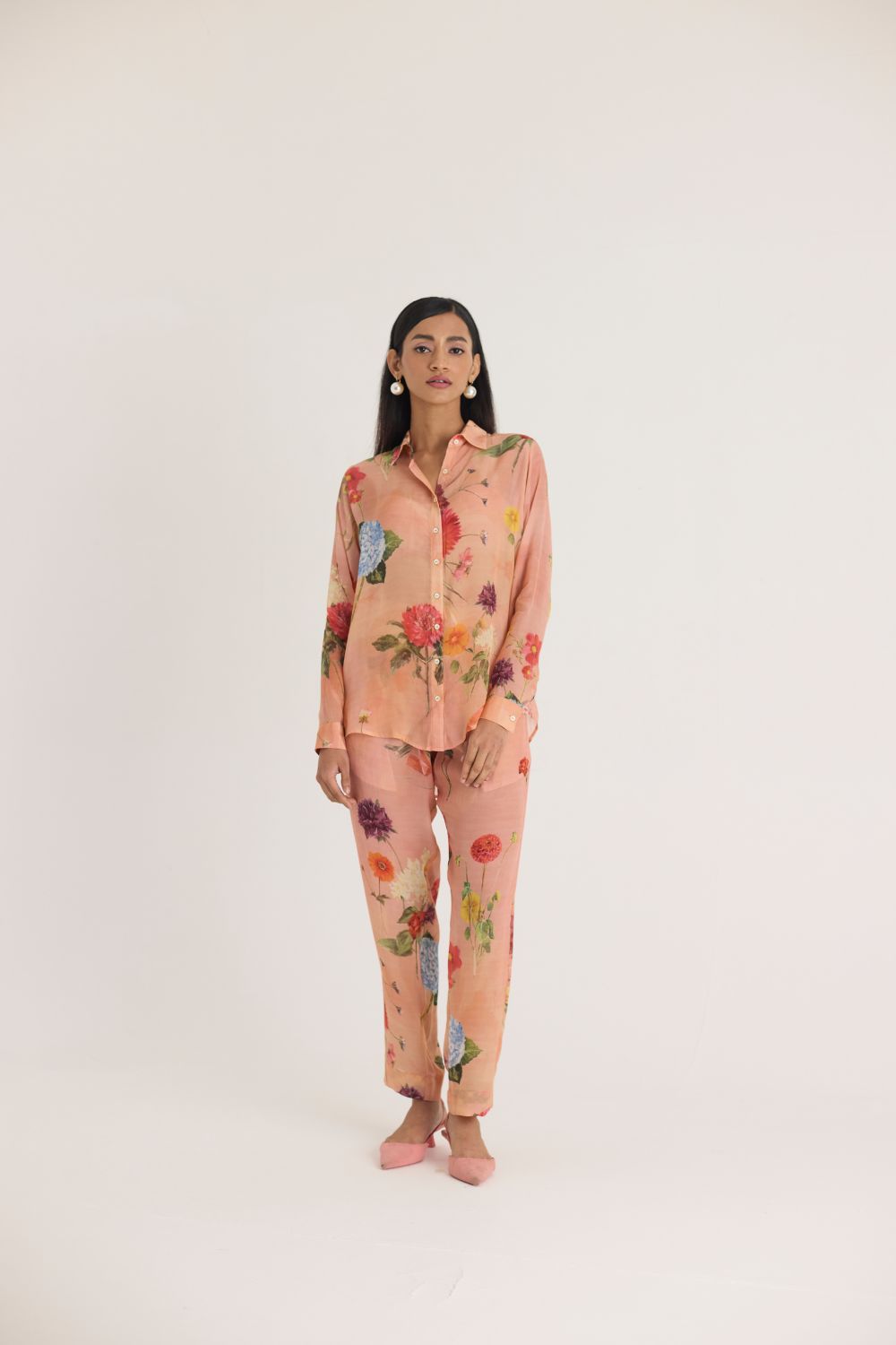 Pair this floral set with minimal pearl or gold jewelry and neutral-toned footwear for an effortlessly graceful look.