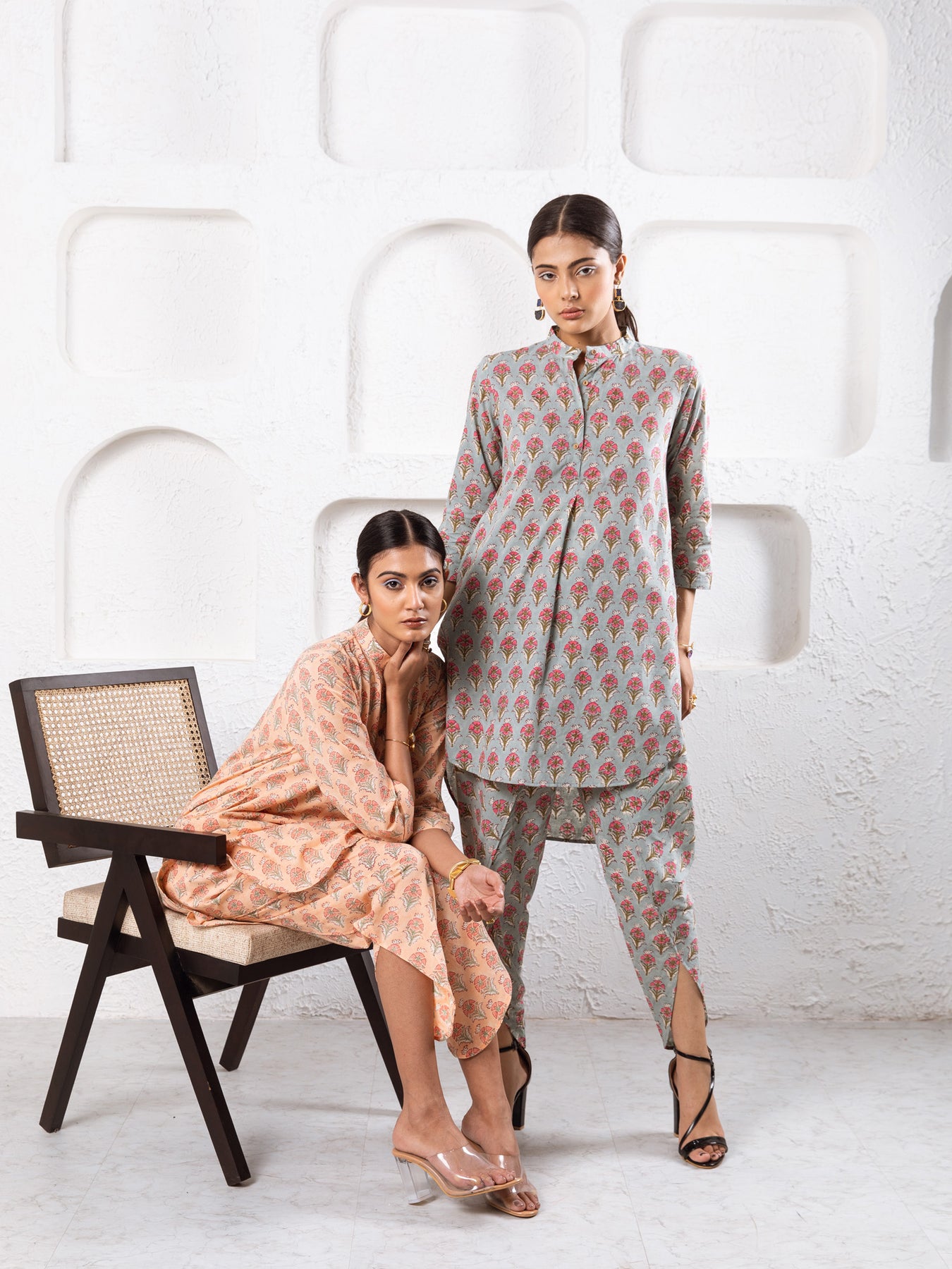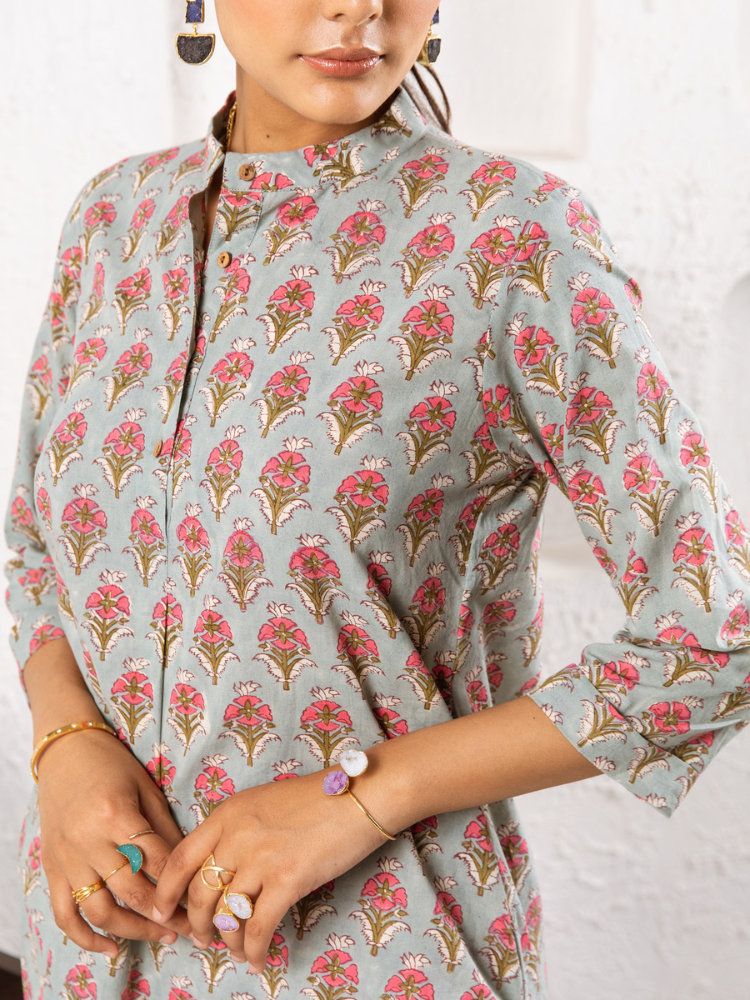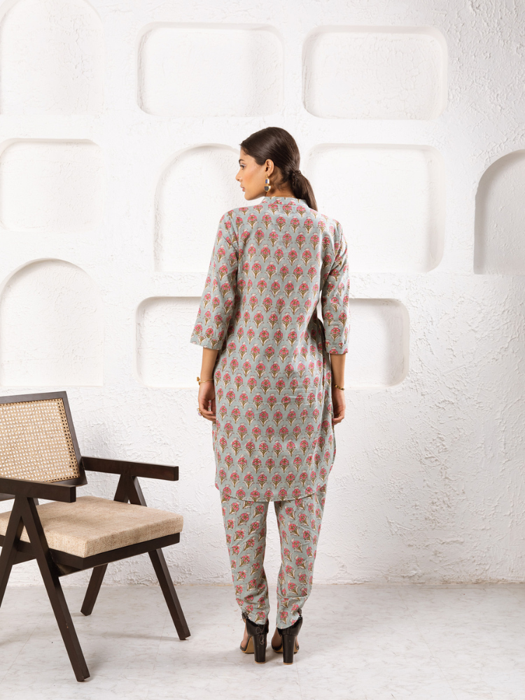 Delilah - Bright like the summer sun and beautiful like the first dawn of spring. Grey & Pink is our all-time favourite colour combination. Our most loved style in this oh-so-summer print is a wardrobe must-have. This classic set consists of a printed tunic paired with matching trousers.