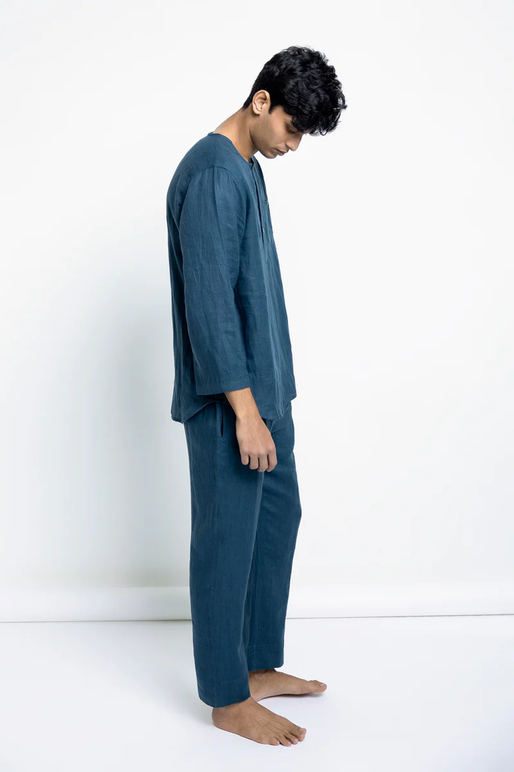 This pure linen shirt and pyjama set is so comfortable, it will sing you to sleep. Wear at night, but also while lounging through the day, G&T in hand, or while working from home. This versatile, easy-to-maintain set is created in shades of Indigo, Khaki, Slate, Cinnamon and Undyed with details that appear slowly like little surprises - wooden buttons, drawstrings, pockets, best wishes.