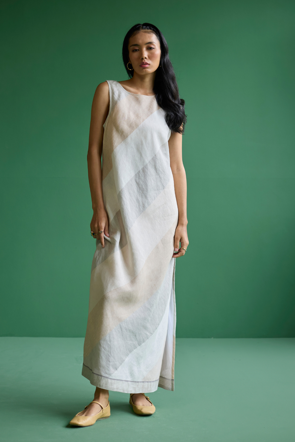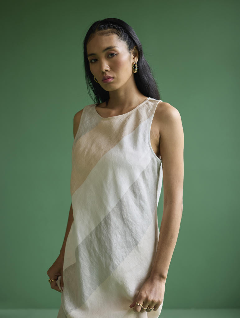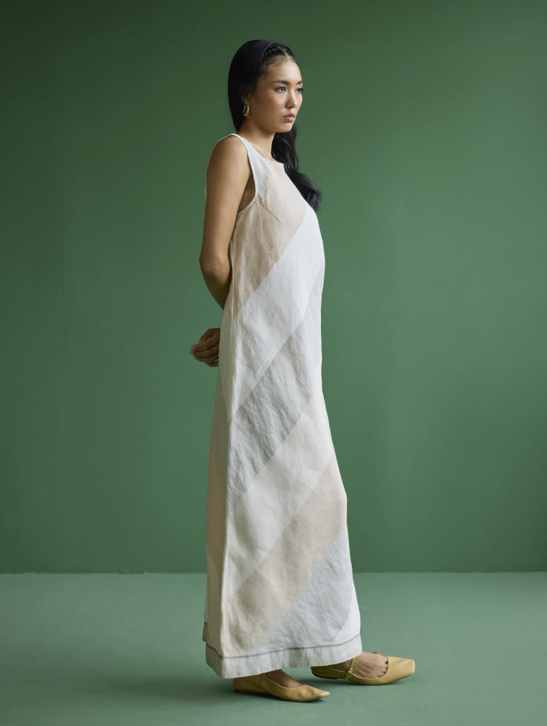 An ankle-length bias cut sleeveless dress, in our signature statement yarn-dyed metallic broad striped linen in tones of ivory, is perfect for both a brunch with friends or for a formal evening get-together. Pair with a bold jewelry cuff or layer with bracelets for an elevated look.
