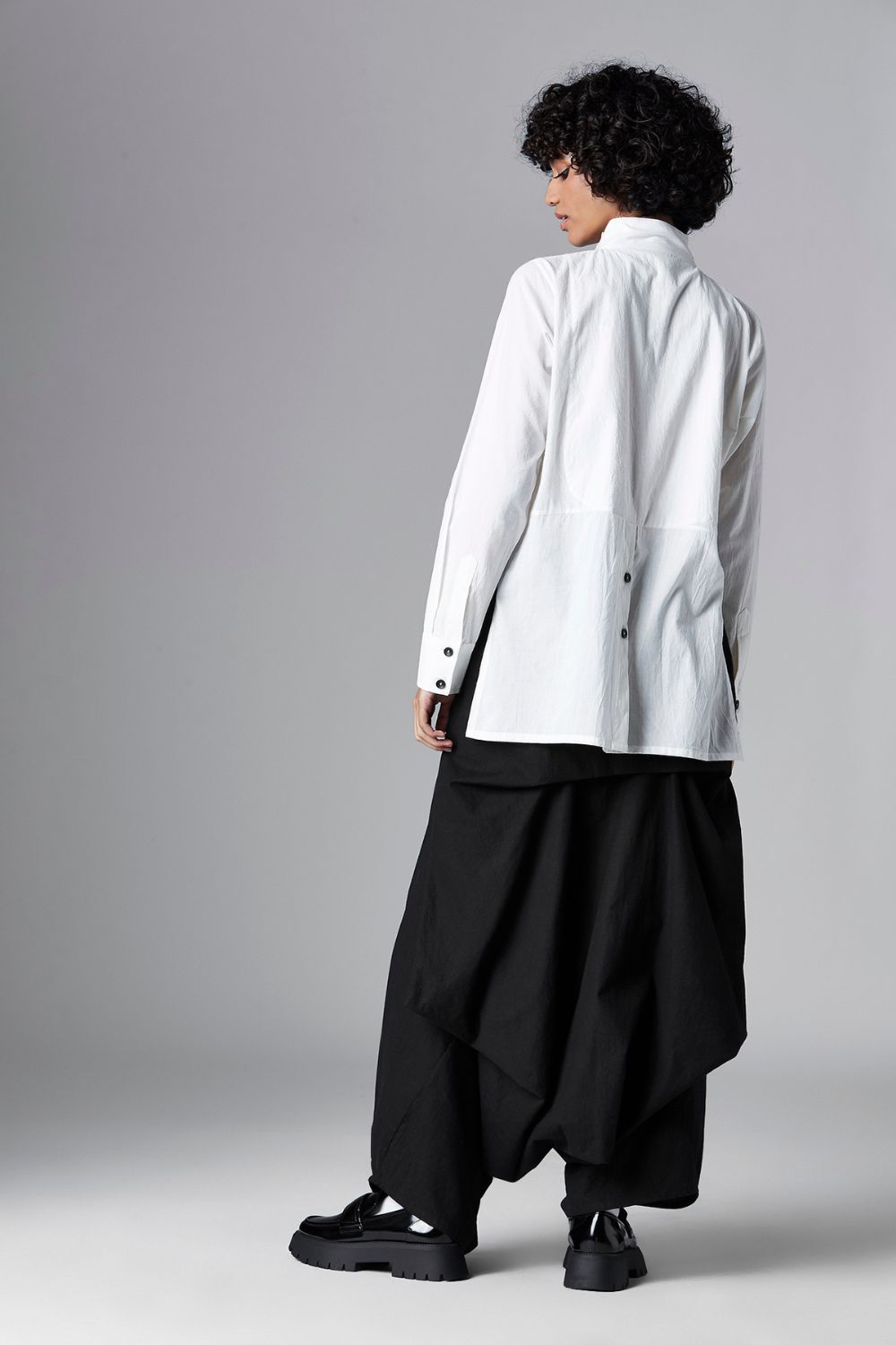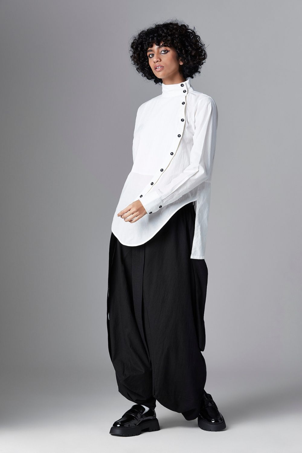 The Mika shirt features a stand collar, curved front button placket and curved hem at the front. Additionally, it features narrow sleeves and a half button-down placket at the back.
