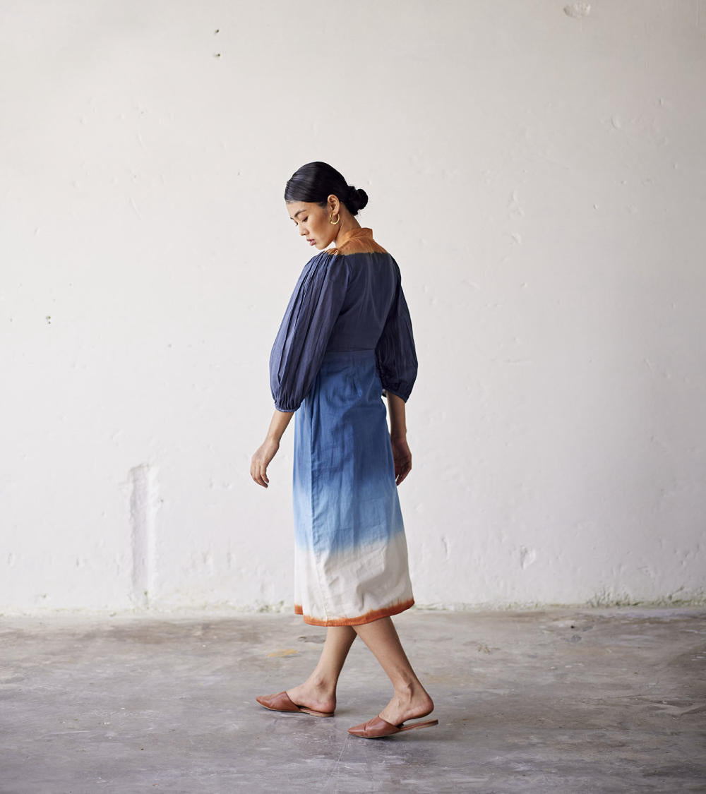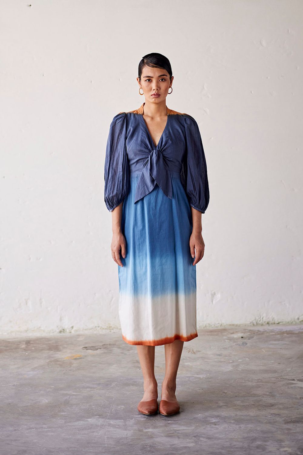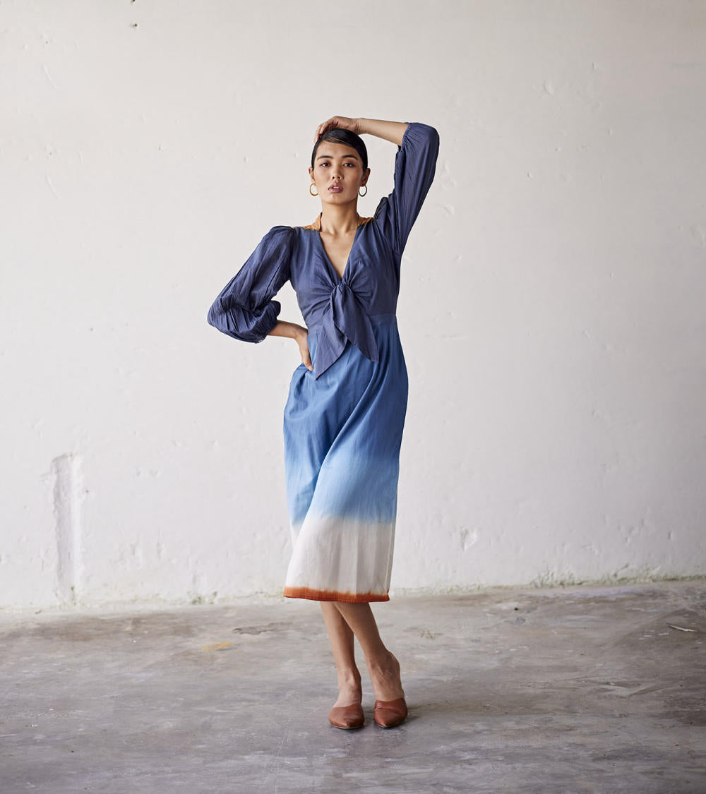 A blue dip dyed ombre mul dress with a tie-up detailing at the front, side zip, and an elasticated sleeve hem.