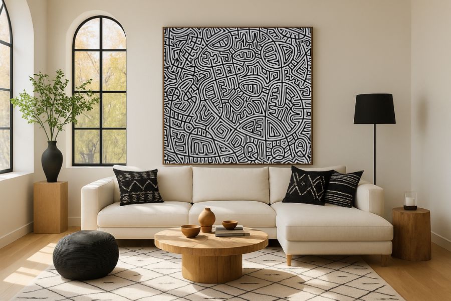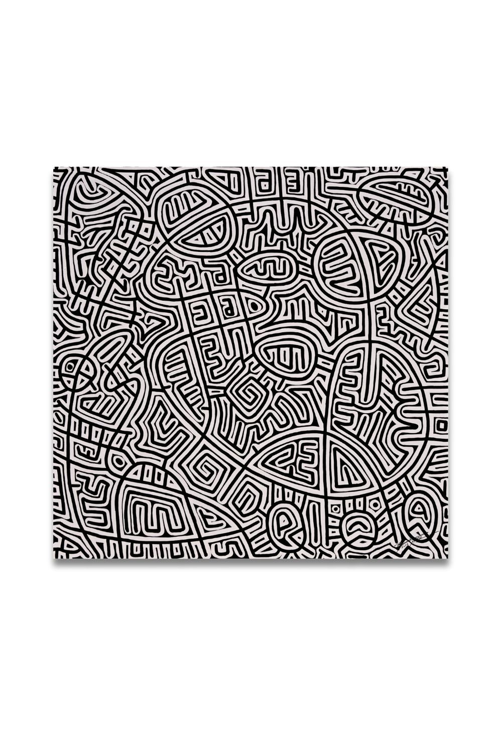 Merging the ethos of folk art with a distinctly modern sensibility, Bhuwal transforms traditional symbolism into a dynamic language of the present. His work captures the pulse of urban life — dense, complex, alive — while remaining rooted in the timeless discipline of hand-drawn line. His art invites viewers to lose themselves in its labyrinths — to find, within the crowd, a reflection of the self. With every shift of the eye, faces, animals, and abstract forms surface and disappear, offering fresh discoveries at every glance.