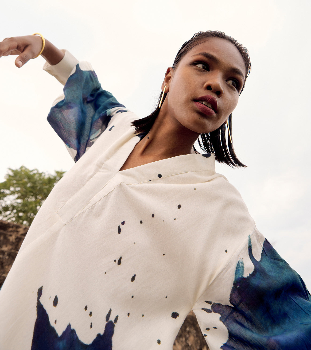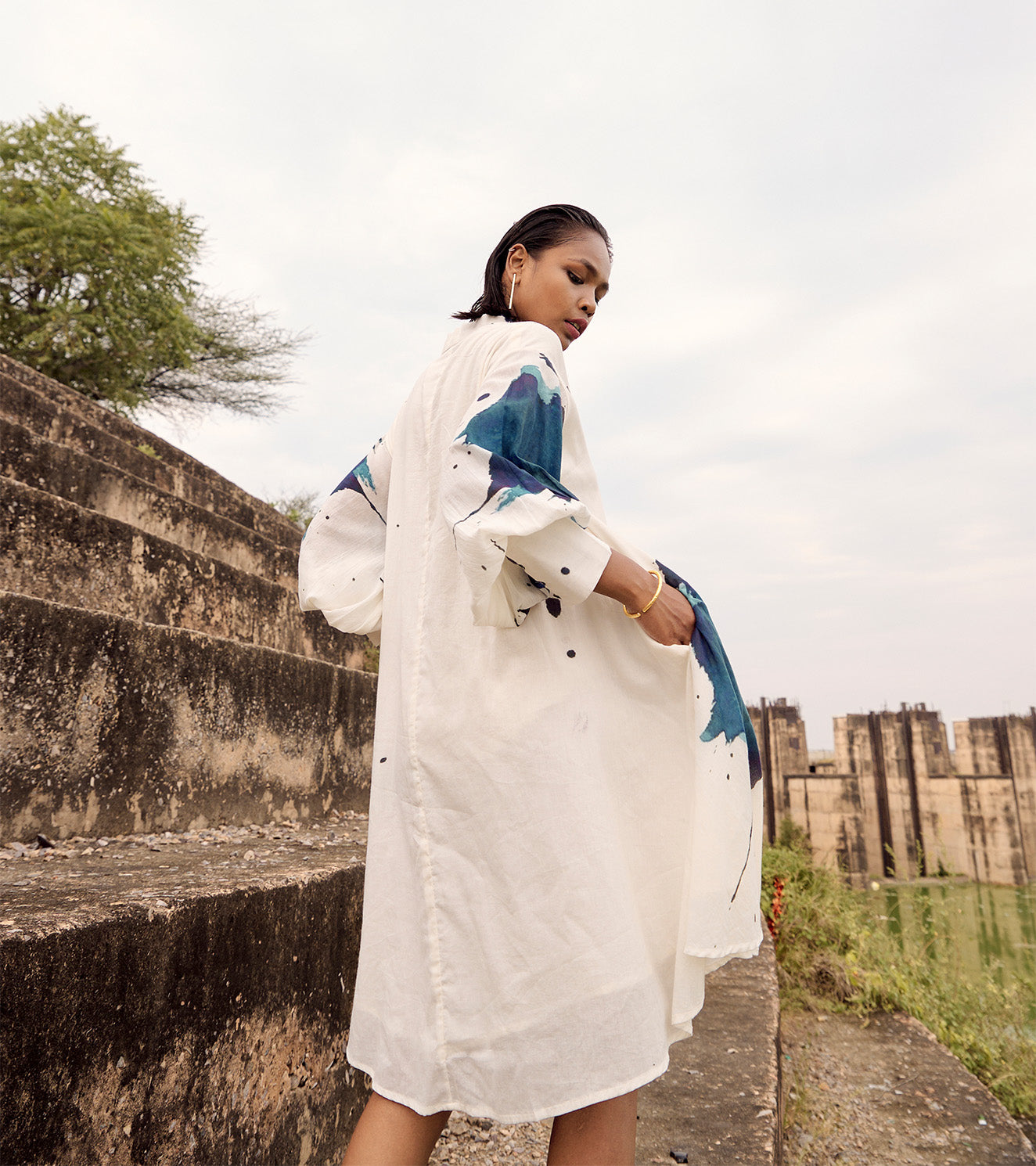 An off white mul dress with kimono style neckline and full sleeves with button cuff opening.