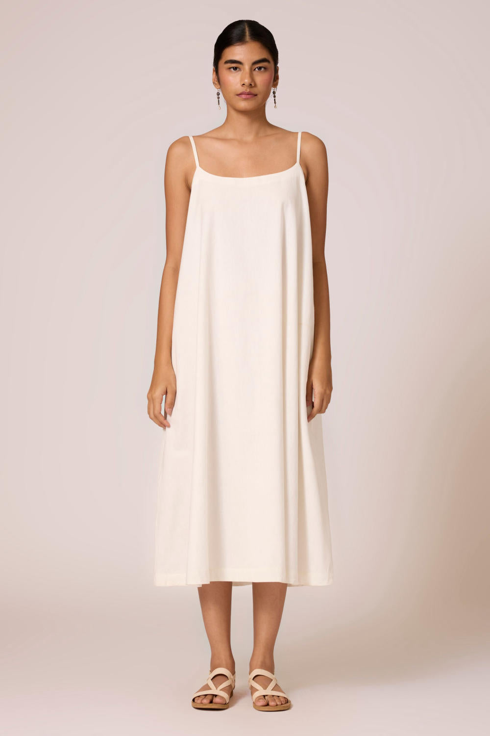 A slip dress in handspun and handwoven cotton. Featuring a wide neckline, adjustable straps and inseam pockets.