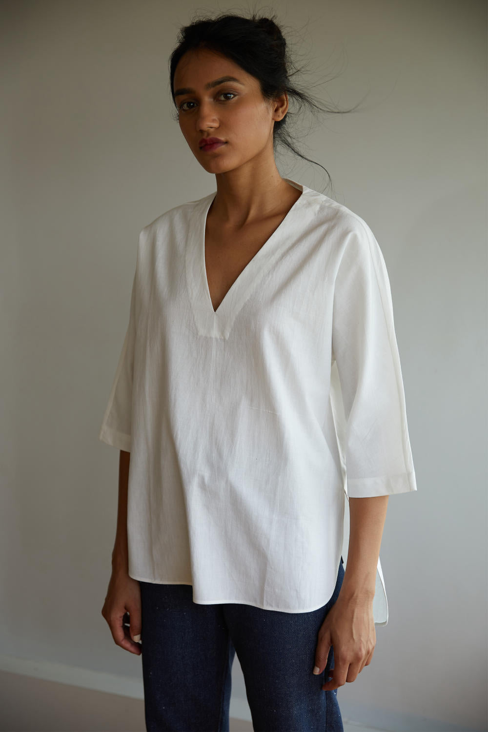 Draped V-neck top designed for ease. Made from mid weight breathable Khadi. High low curved hem. Moderate length sleeves.