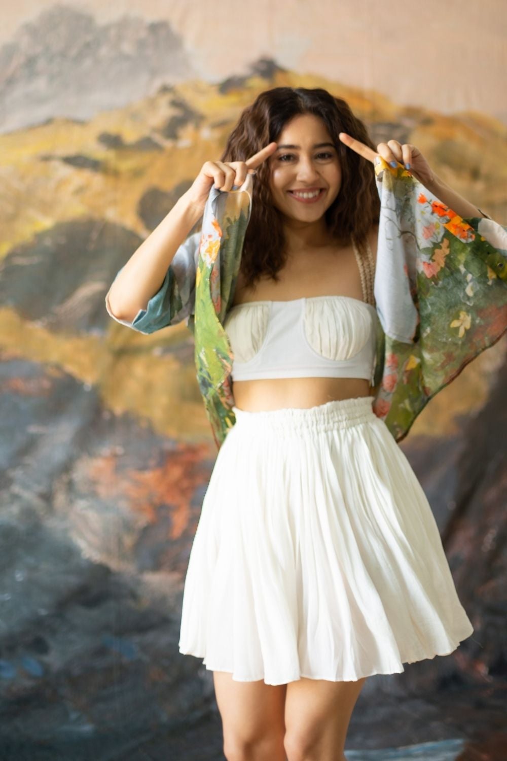 The bralette is made in crepe and cotton with lace detailing on the strap. The shorts are elasticated on the waist. The Nazara Shirt is a special hand painted and printed shirt featuring a seaside painting on a cotton mulmul base.