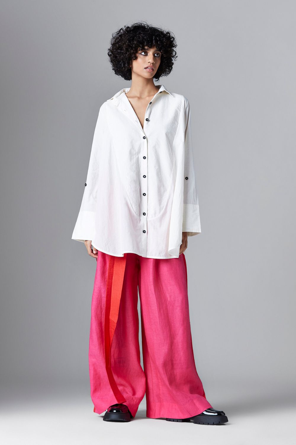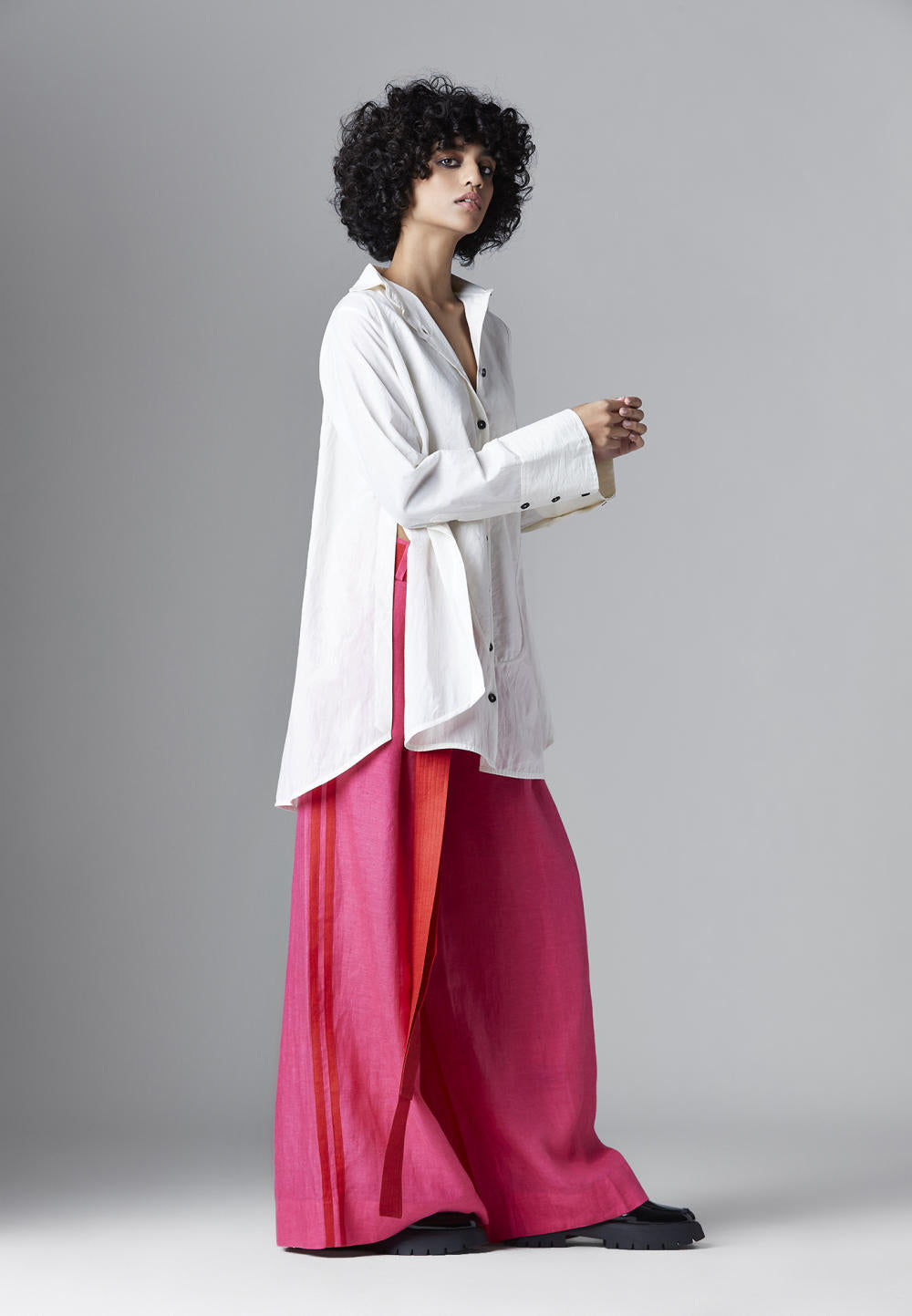 Chola’s universe begins with thoughtful materials. Recycled cottons, post-consumer fabrics, and free-cutting techniques come together in a kind of mindful choreography—one that honours form without creating waste, and prioritises movement over rigidity. This is clothing that feels lived-in yet architectural; pared-back yet quietly avant-garde.