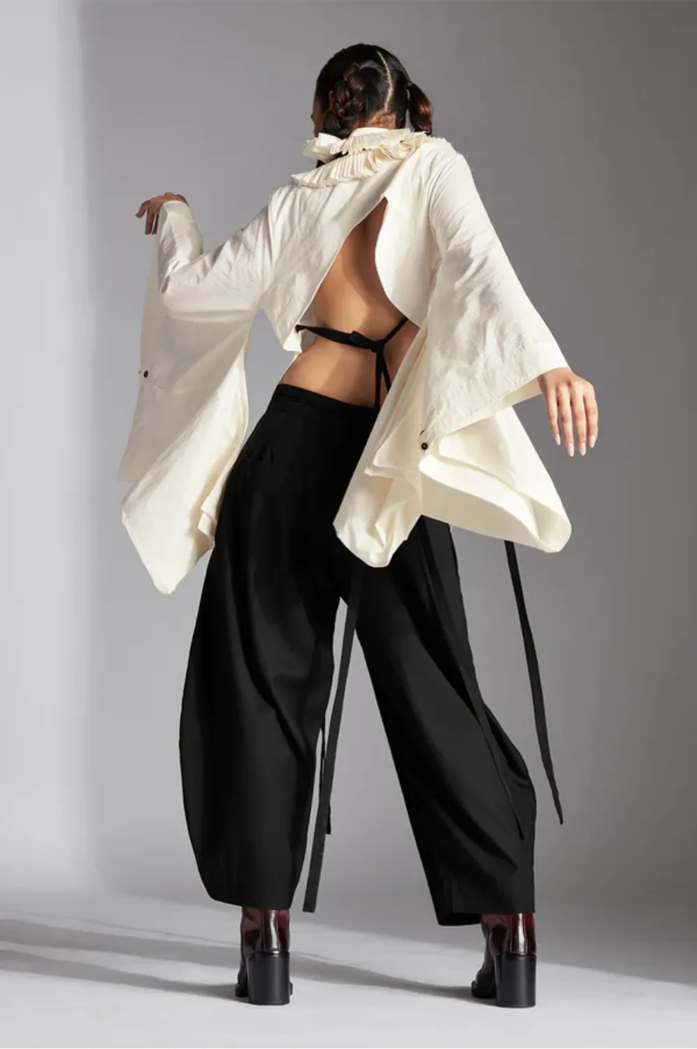 Evra is a backless shirt with stand collar, detachable pleated frill collar, deconstructed sleeves and back-tie-ups.