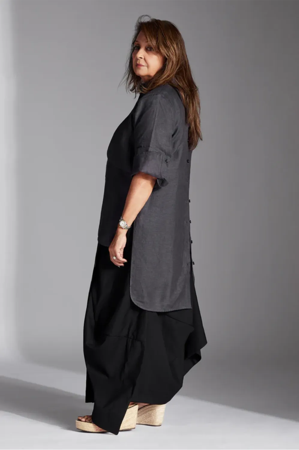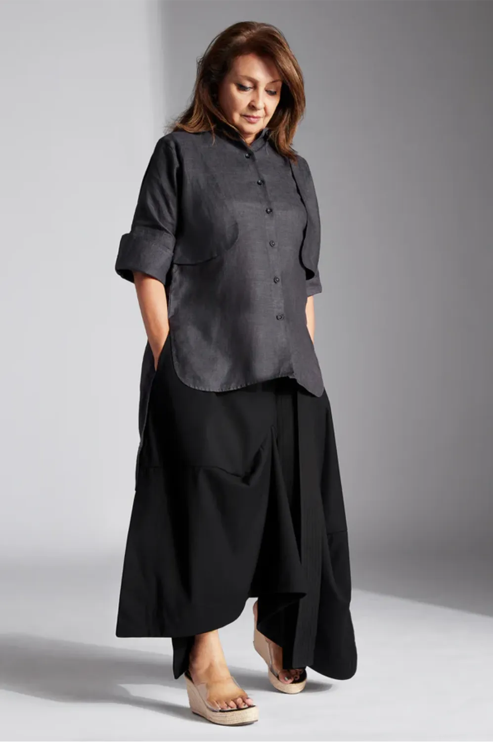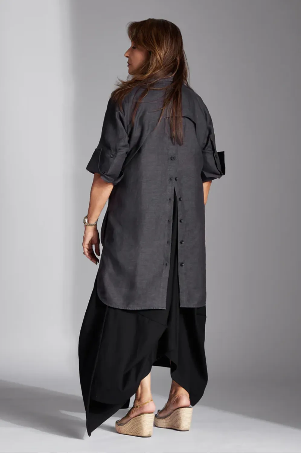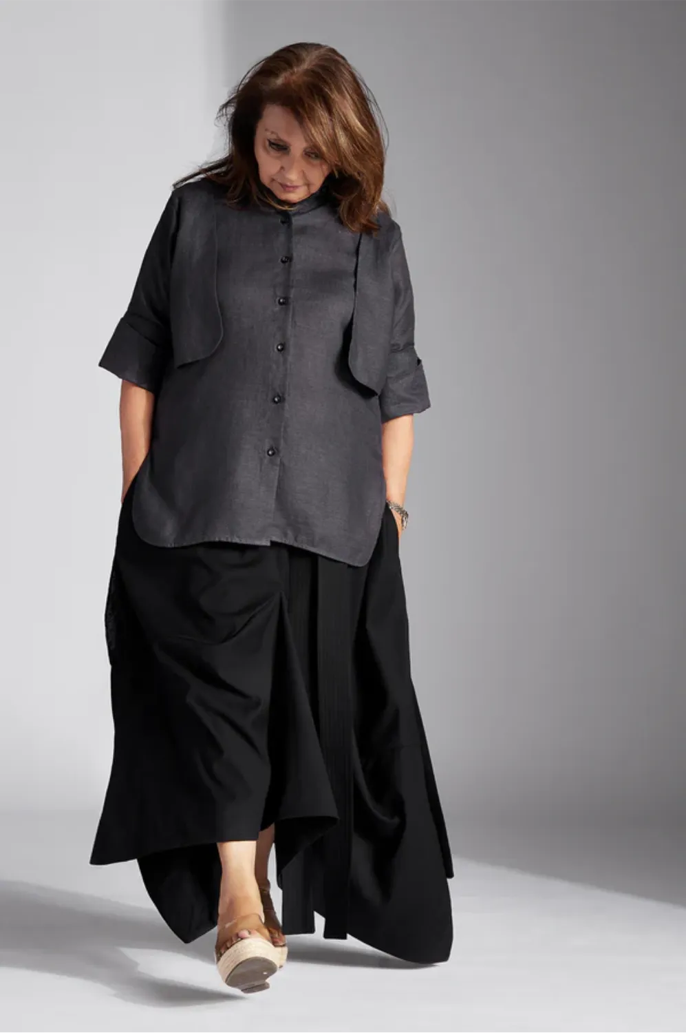The Lysa shirt exhibits a high-low style with shirt double shirt collar, front button placket, trench flaps, three-fourth sleeves with cuff and curved back flap with buttons.