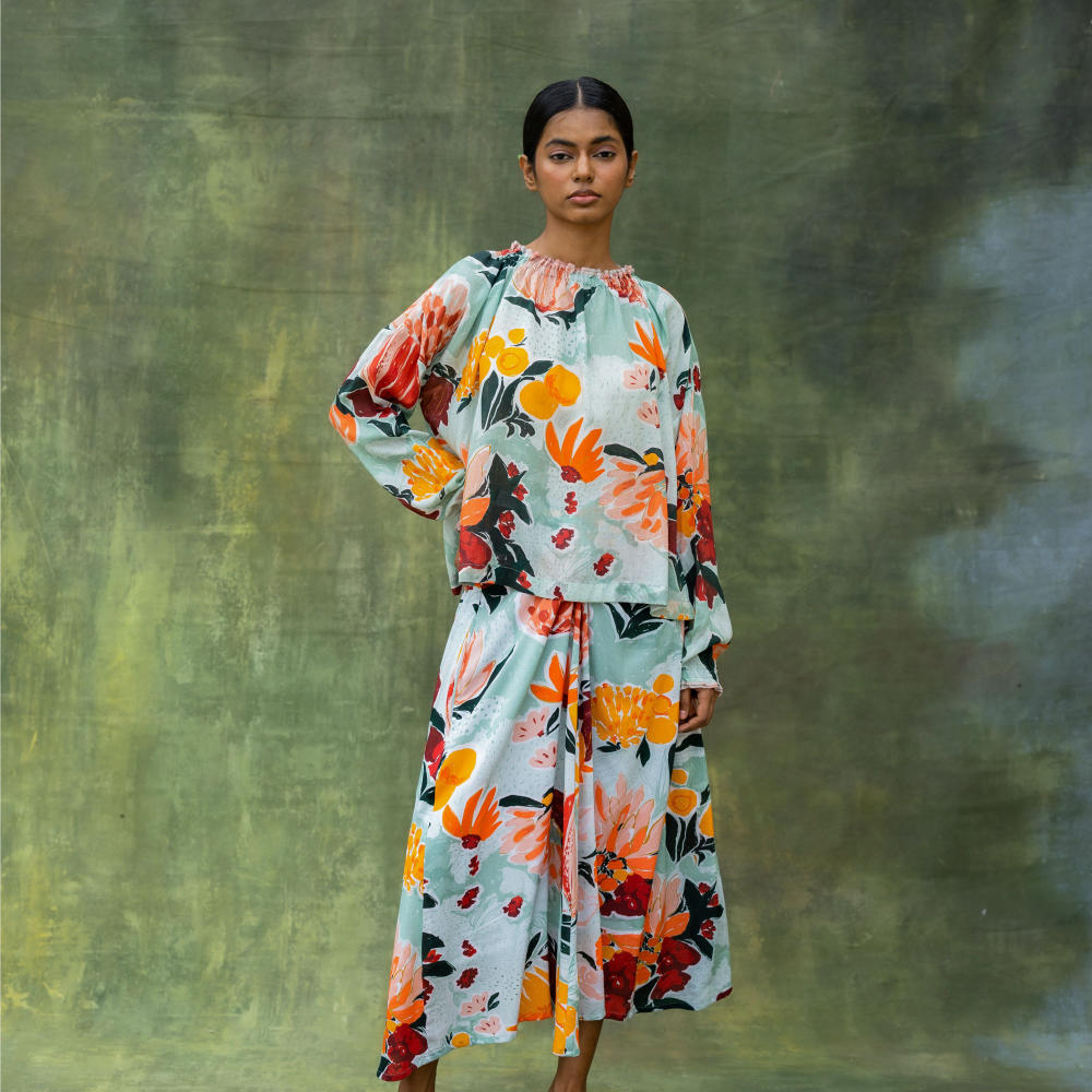 Printed top with neck gathers and button down back. Top can be worn with front or back opening. With front knot printed skirt with elasticated back. Mid calf length.
