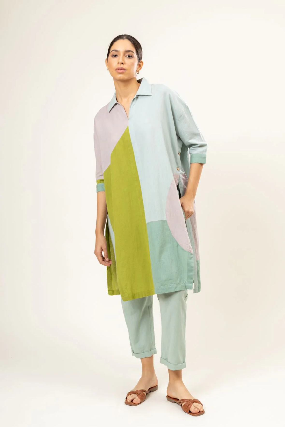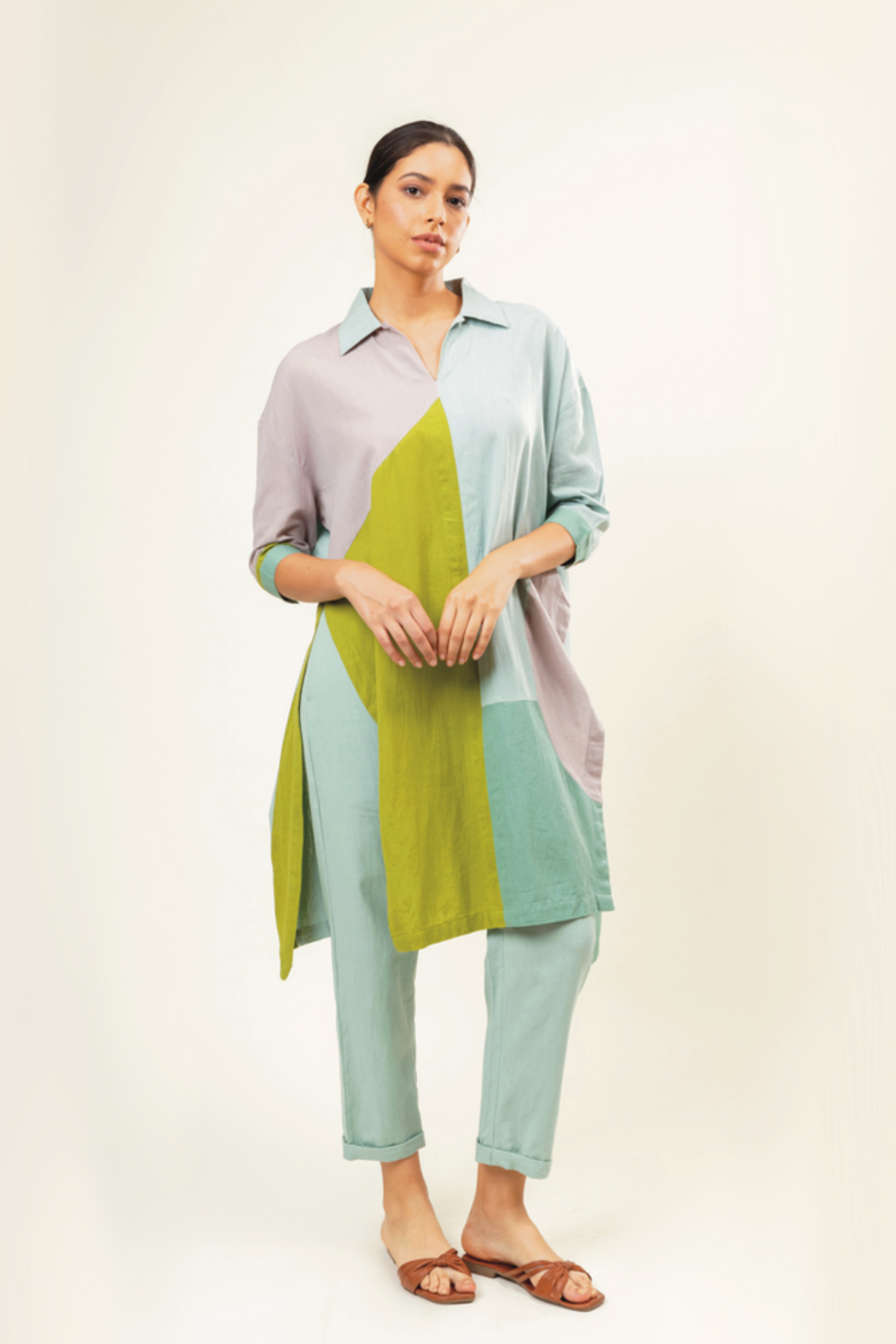 Description: Oversized panelled tunic with long side slits and cuffed sleeve