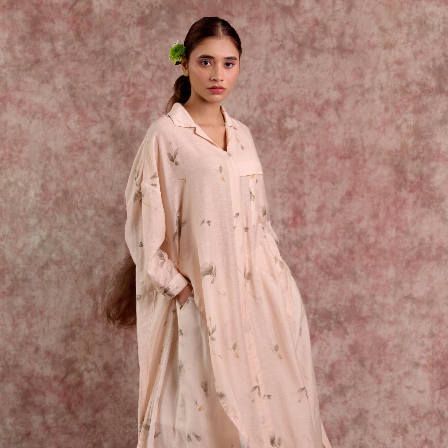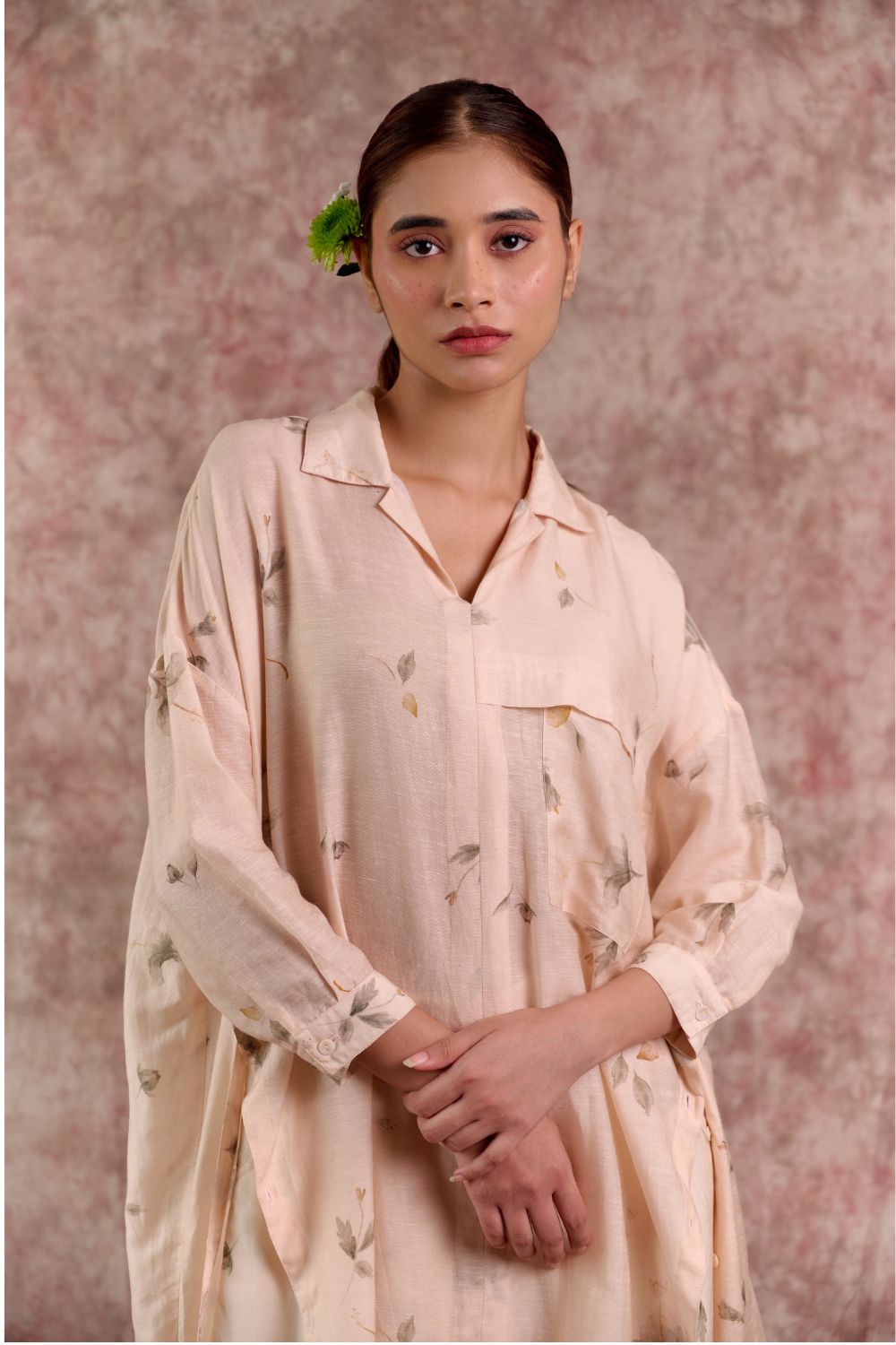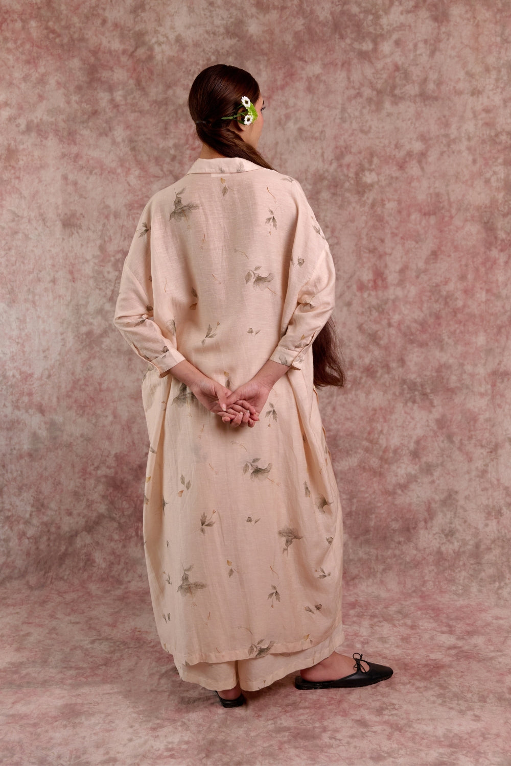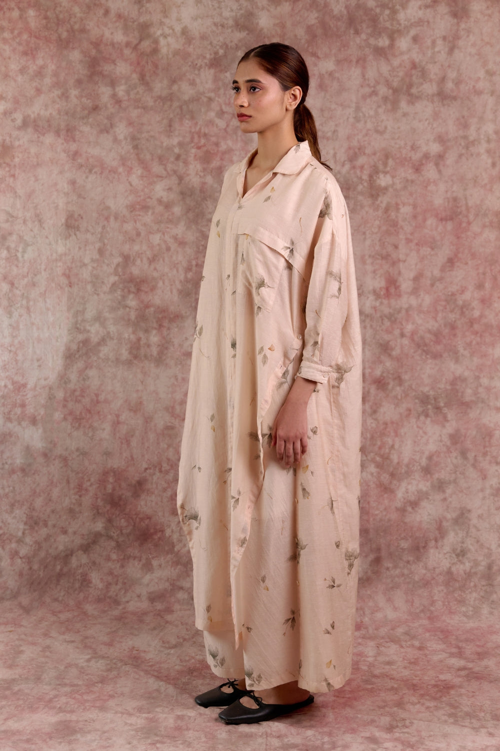 A thoughtfully designed co-ord set that blends ease with elegance. The oversized printed tunic features sharp collars, cuffed sleeves, and long side slits that create fluid movement, while the relaxed-fit pants are tailored with soft front pleats and an adjustable drawstring at the back for a custom fit. Worn together, they create a contemporary silhouette that transitions seamlessly from day to evening, while each piece also stands strong styled on its own.