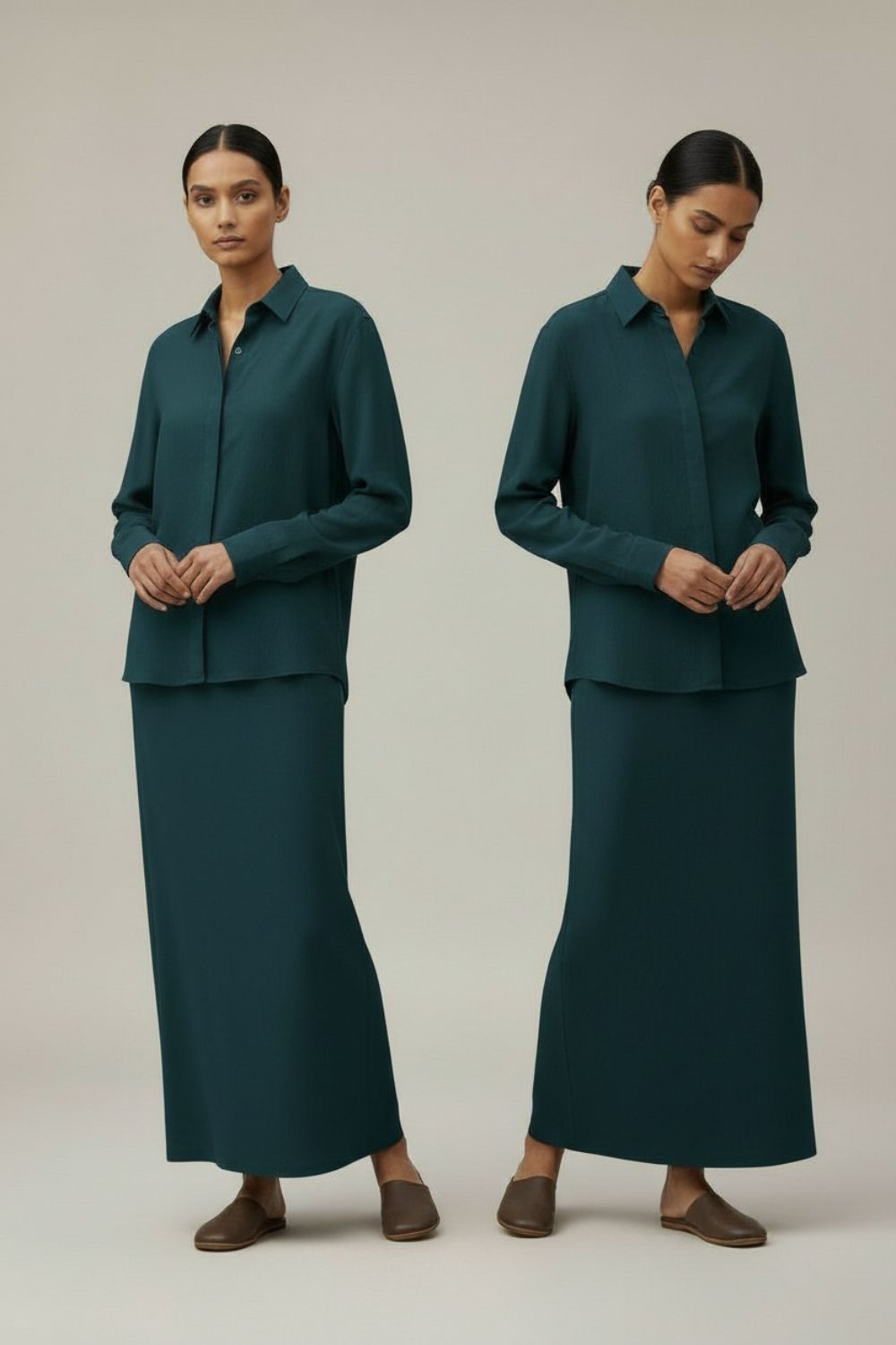 Description: Button down full sleeve shirt. Straight skirt with a slit at back. The skirt comes with a side zipper closure and side pocket.