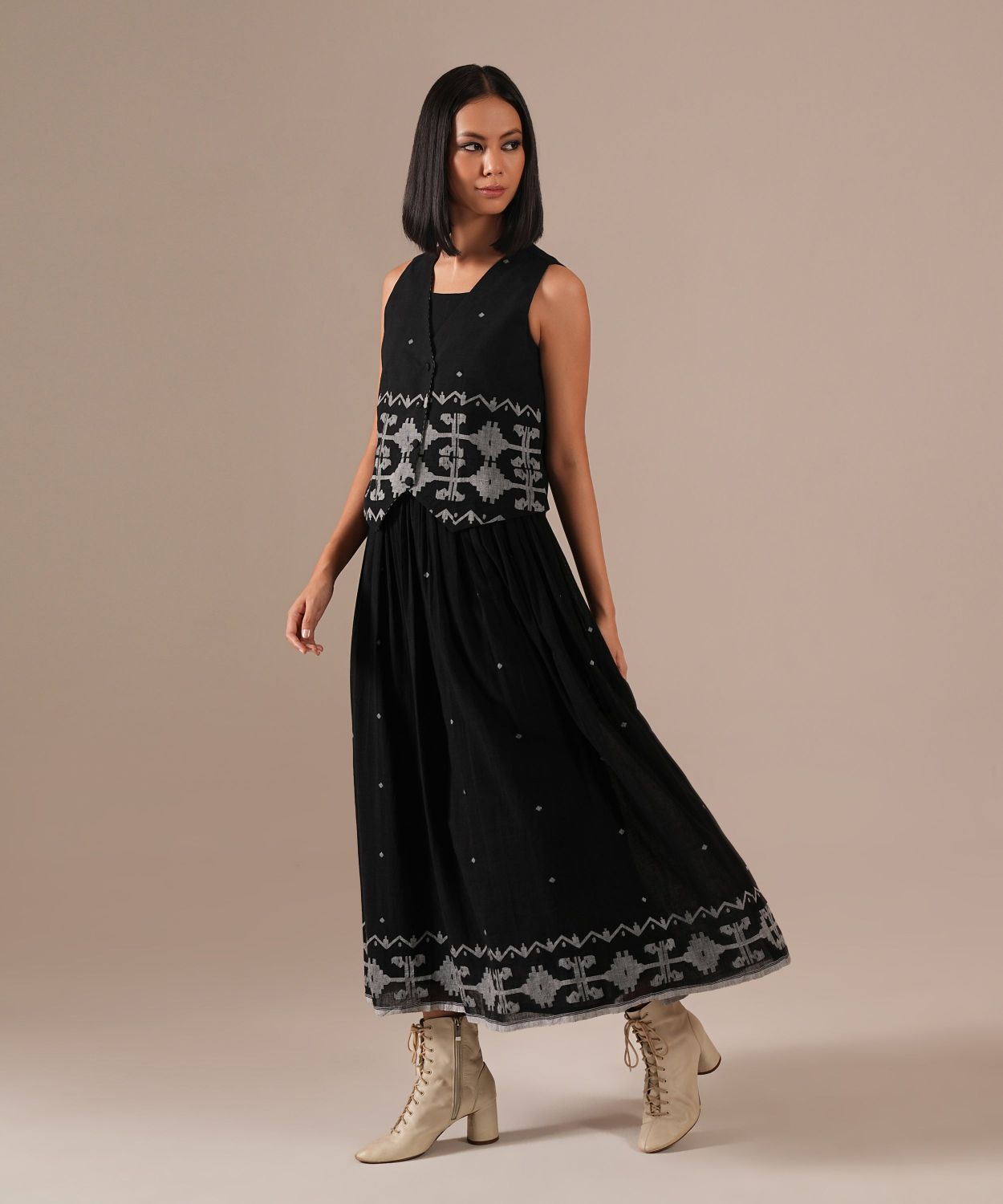 A classic Jamdani ensemble with a fit-and-flare dress (adjustable straps, back zipper, side pockets) paired with a tailored waistcoat with contrast lining and a quilted fabric belt. Handwoven by Indian artisans.