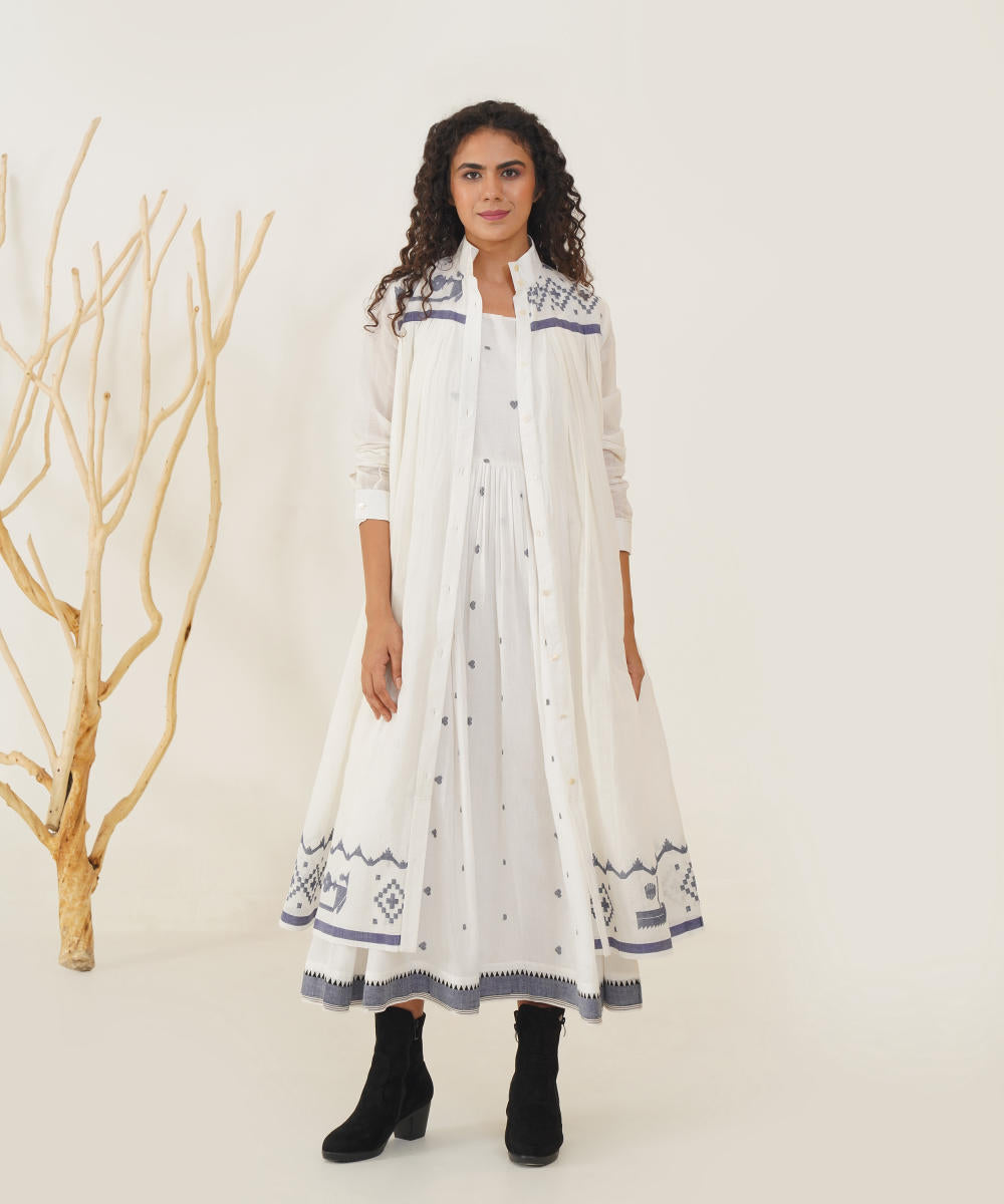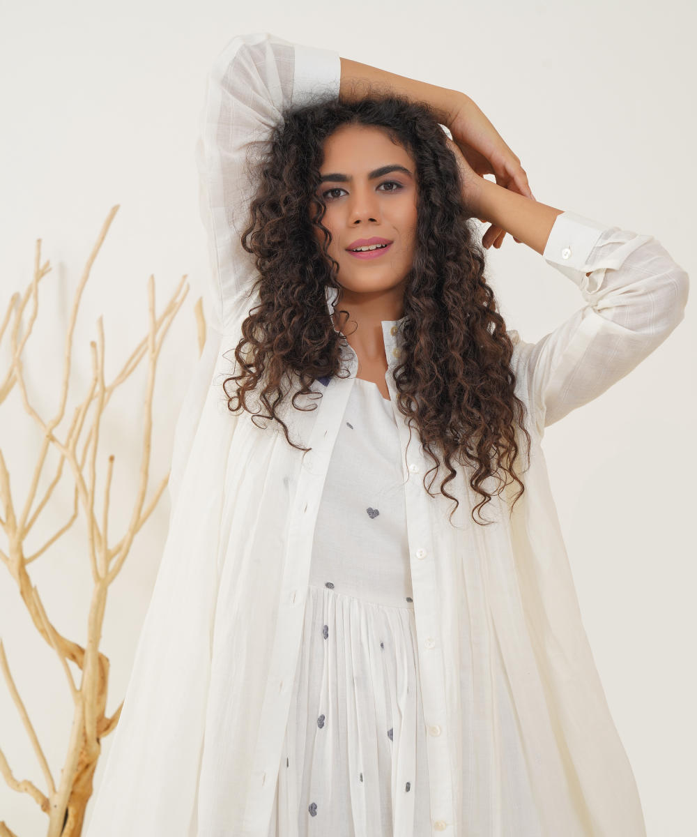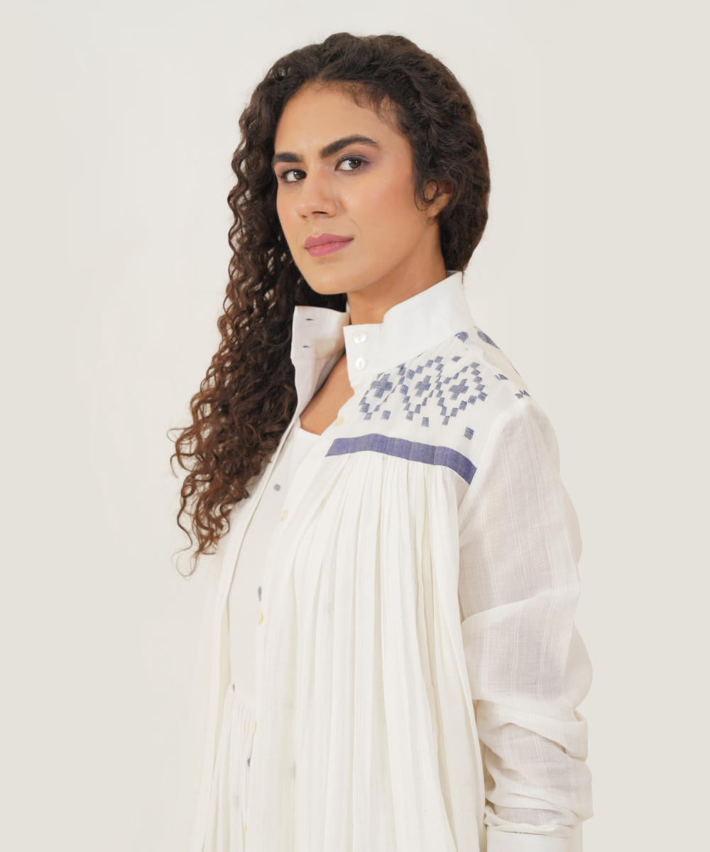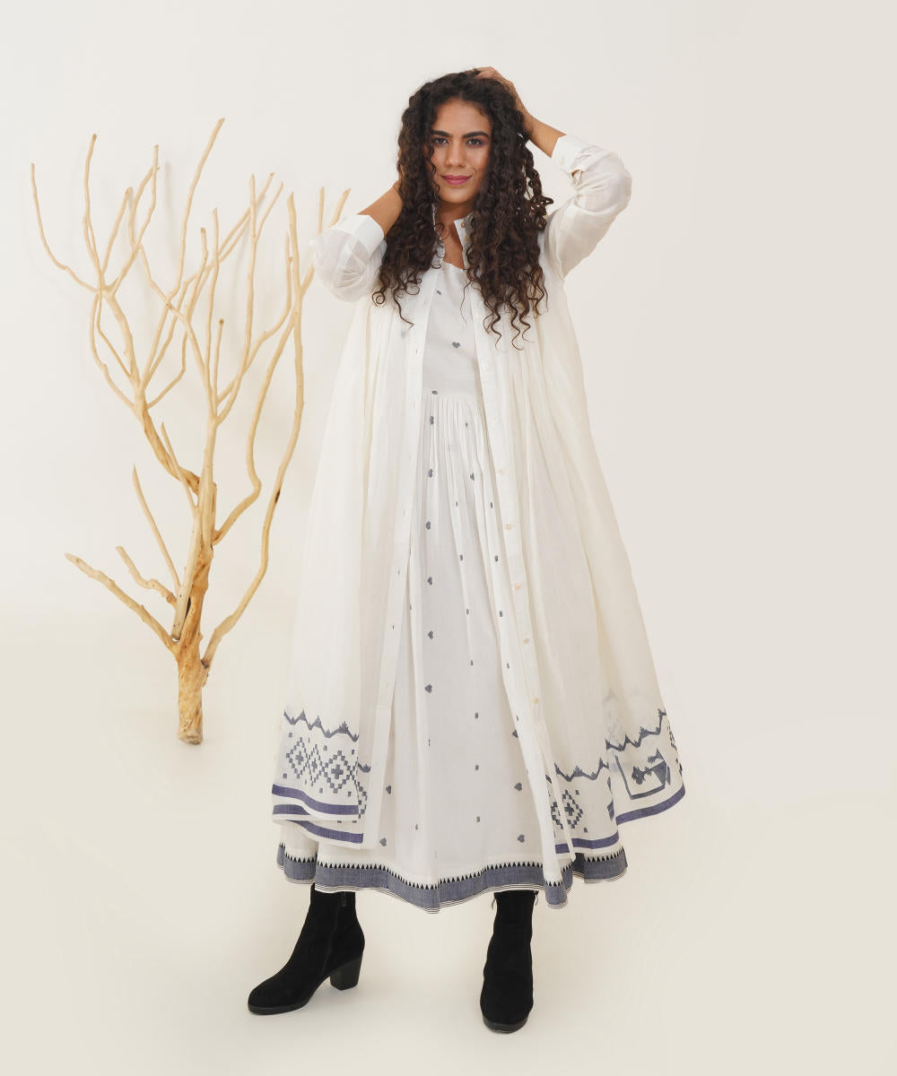Embrace timeless elegance with our classic Jamdani ensemble. This piece features an exquisite high collar and a chic front button fastening, complemented by full sleeves and gentle pleats at both the front and back for a flattering silhouette. Accompanied by a beautifully handwoven Jamdani slip dress, this ensemble ensures comfort while offering versatile styling options. Effortlessly dress it up or down to make a statement at any occasion.