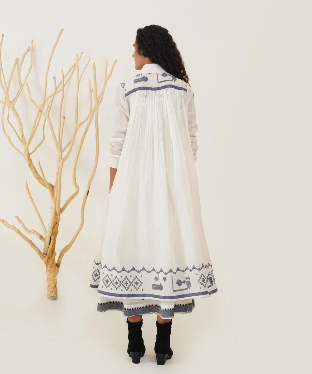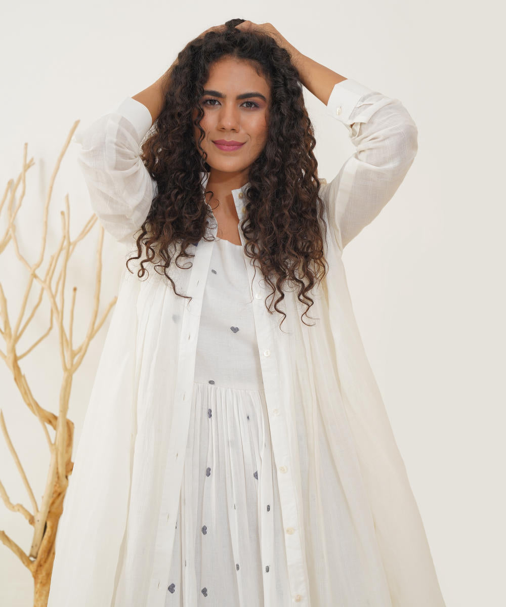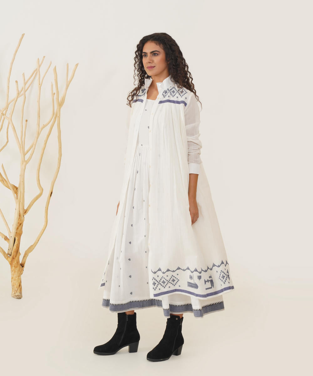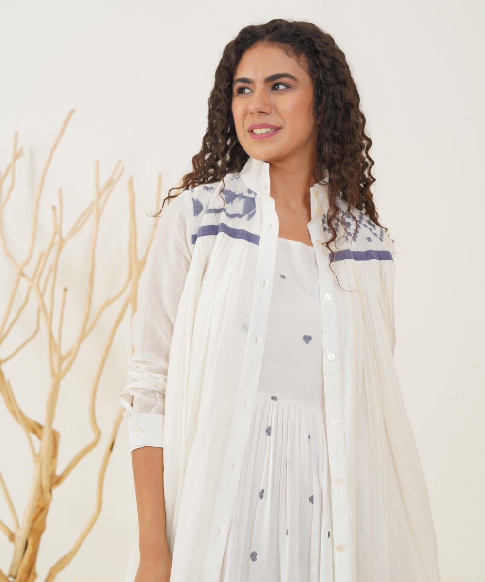 Embrace timeless elegance with our classic Jamdani ensemble. This piece features an exquisite high collar and a chic front button fastening, complemented by full sleeves and gentle pleats at both the front and back for a flattering silhouette. Accompanied by a beautifully handwoven Jamdani slip dress, this ensemble ensures comfort while offering versatile styling options. Effortlessly dress it up or down to make a statement at any occasion.