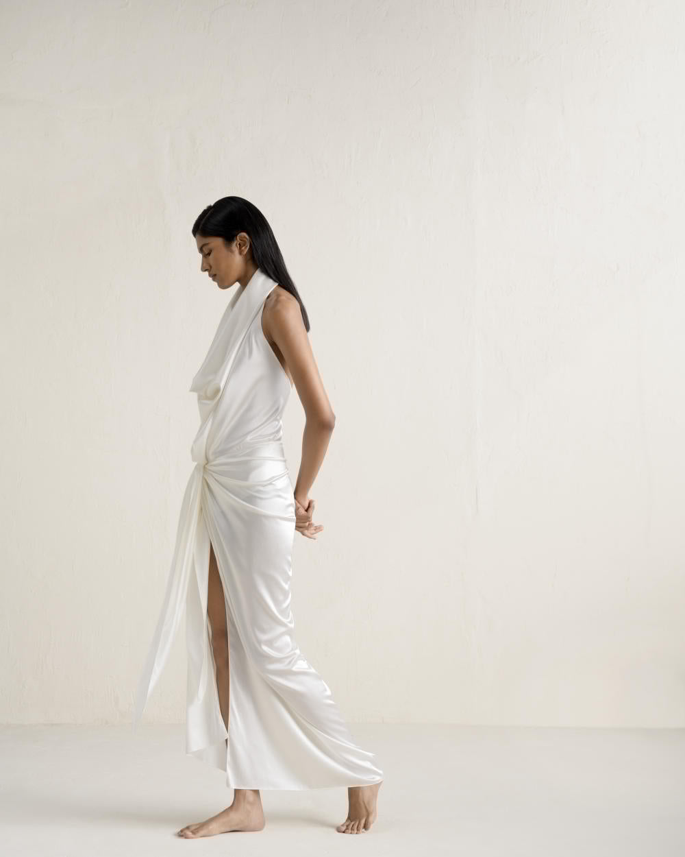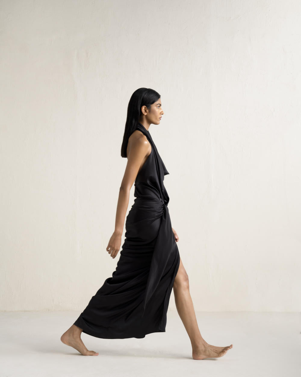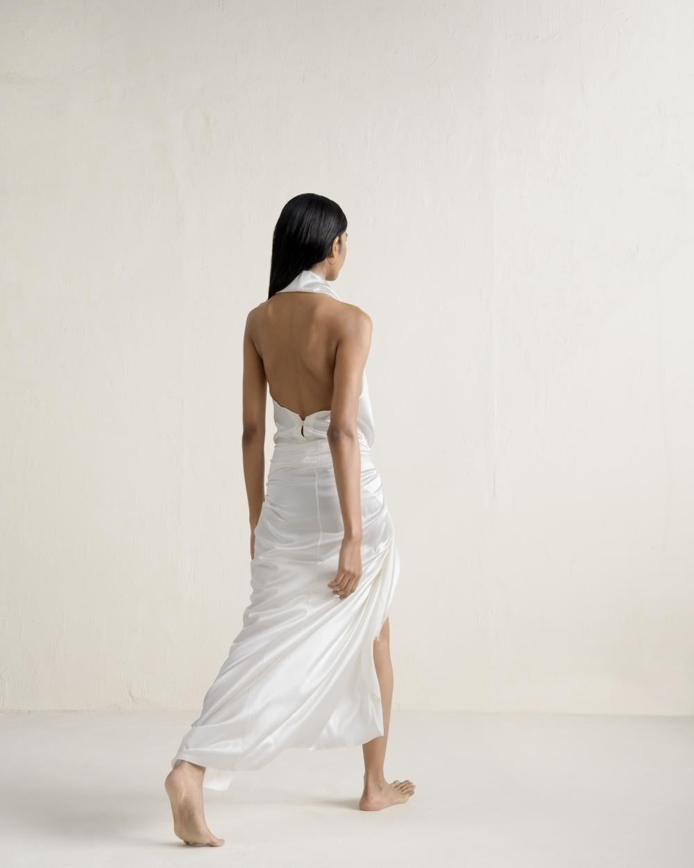 Crafted from luxurious silk, this re-wearable statement piece exudes timeless elegance with its sensual cowl neck top and sarong-inspired skirt. Designed for both sophistication and versatility.