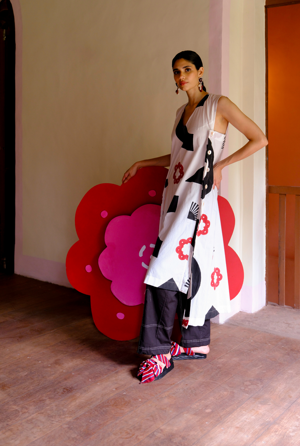 Looking for something bold but easy? This cotton kurta set has a striking block-printed geometric pattern that gives it a cool, graphic vibe. With a clean V-neckline, side buttons, and fun bead details on the back of the button, it’s laid-back but still makes a statement. It is paired with straight-fit trousers crafted in cotton.