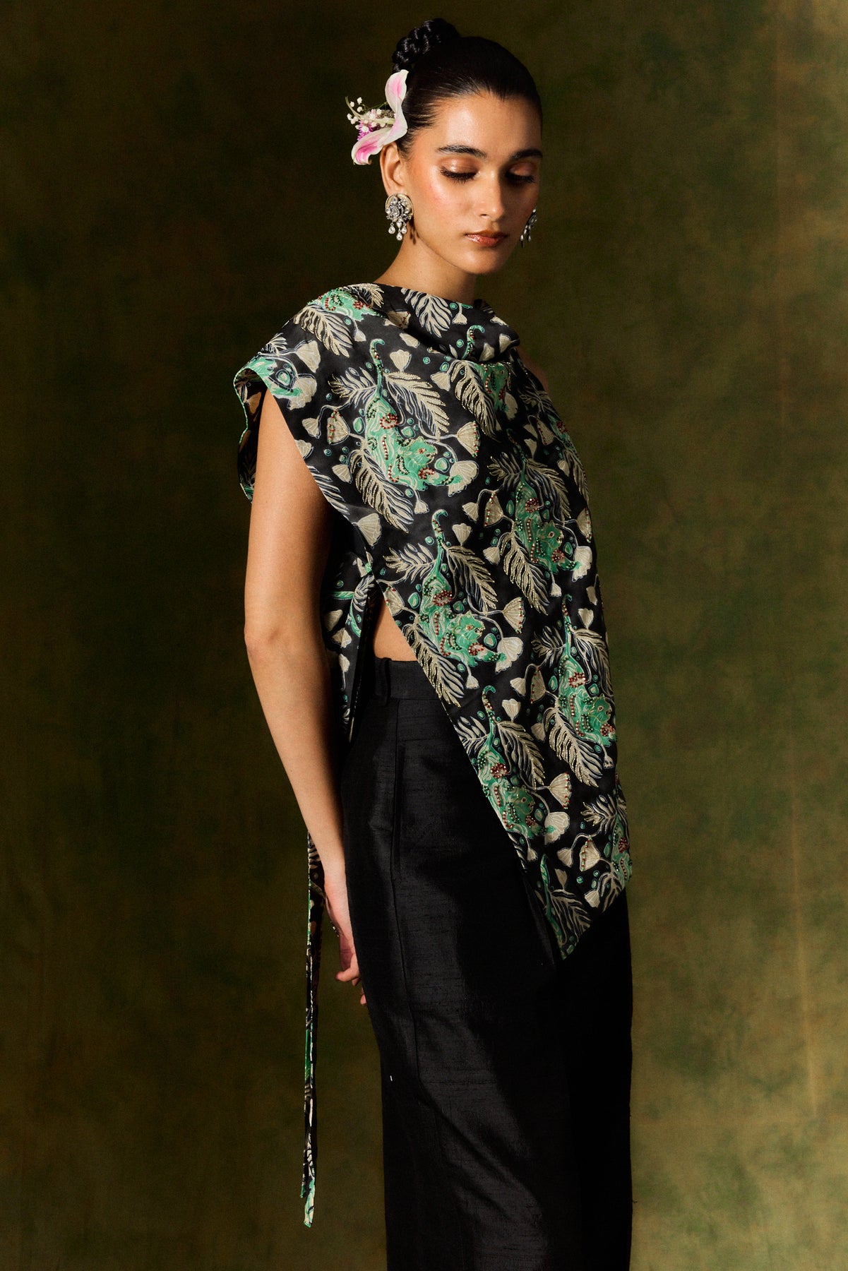 This set is perfect for when you want to look a little extra without lifting a finger! With a draped cowl neck, embroidered bodice, and a flirty tie-up detail, it’s all about effortless charm. The side opening with the asymmetrical hem and the beaded detail at the strap adds just the right amount of sparkle. Pair it with our Rania silk trousers.