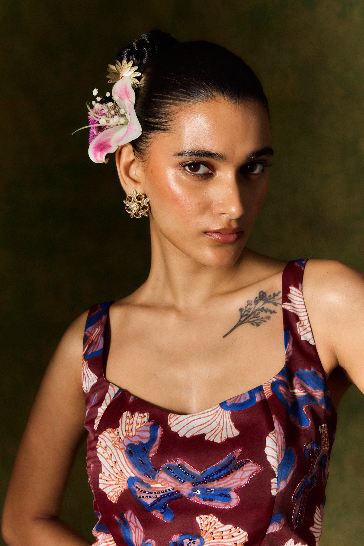 Serving luxe vibes only! Handcrafted in luxurious silk and a bold print, this set comes with a corset top lined with internal boning to support and sculpt and a ruched skirt with a daring side slit, a tie-up waist that knows how to flatter, and a pearl button closure topped with beaded tassels. The top is highlighted with delicate hand embroidery.