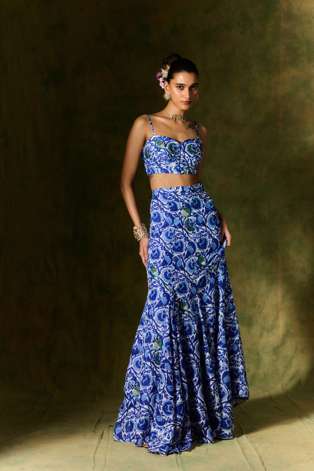 We got you covered for this wedding SZN! This sexy lehenga set is your best bet when you want to turn heads. It features a high-waisted panelled flare skirt and hand embroidery. The flattering bralette features a hand-embroidered bodice with a sweetheart neckline and the delicate bead and sequins embroidery add some glimmer and richness to it.