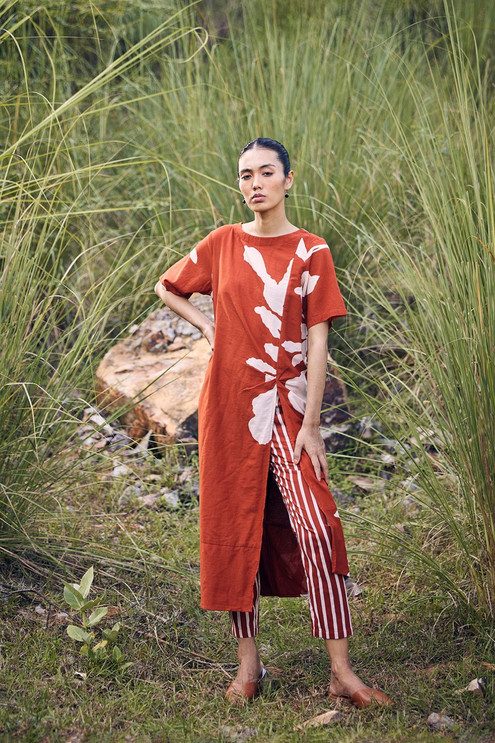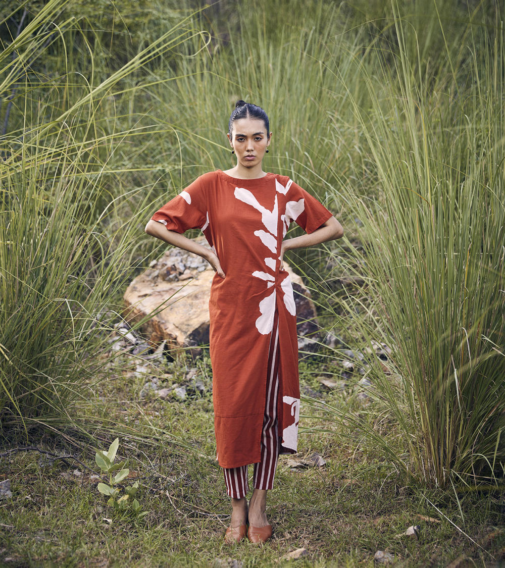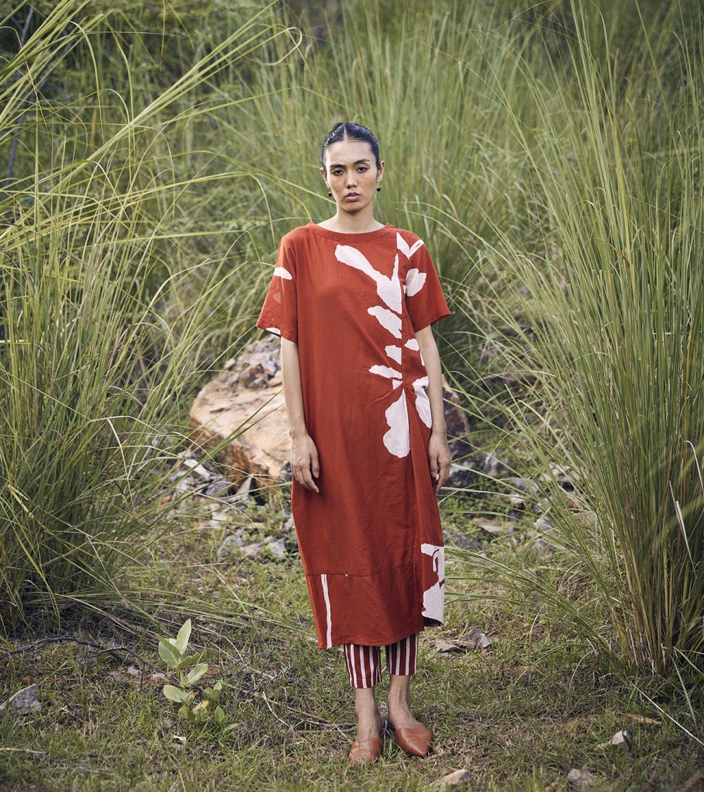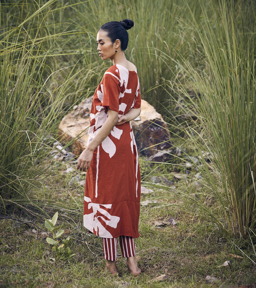 A brick red floral lino print, anti-fit tunic dress with a boat neck and side slit, comes with full lining.