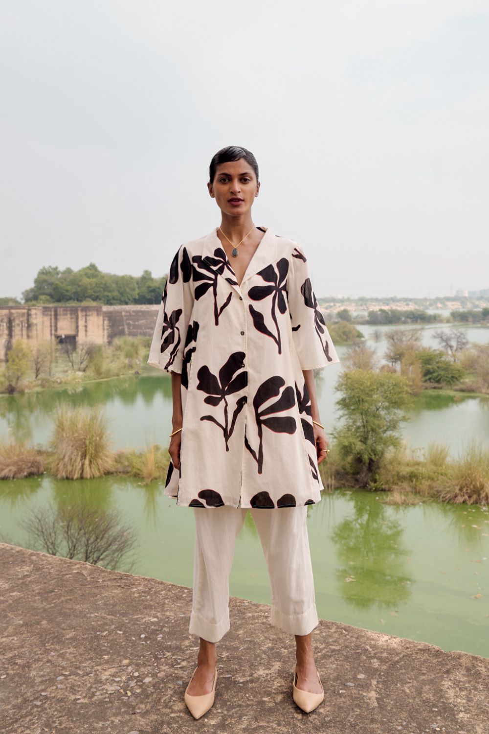 An off white lino print mul co-ord set. The tunic comes with front button opening, front pockets and lapel collars. Comes with a regular trouser with button opening, side seam pockets and elasticated back.