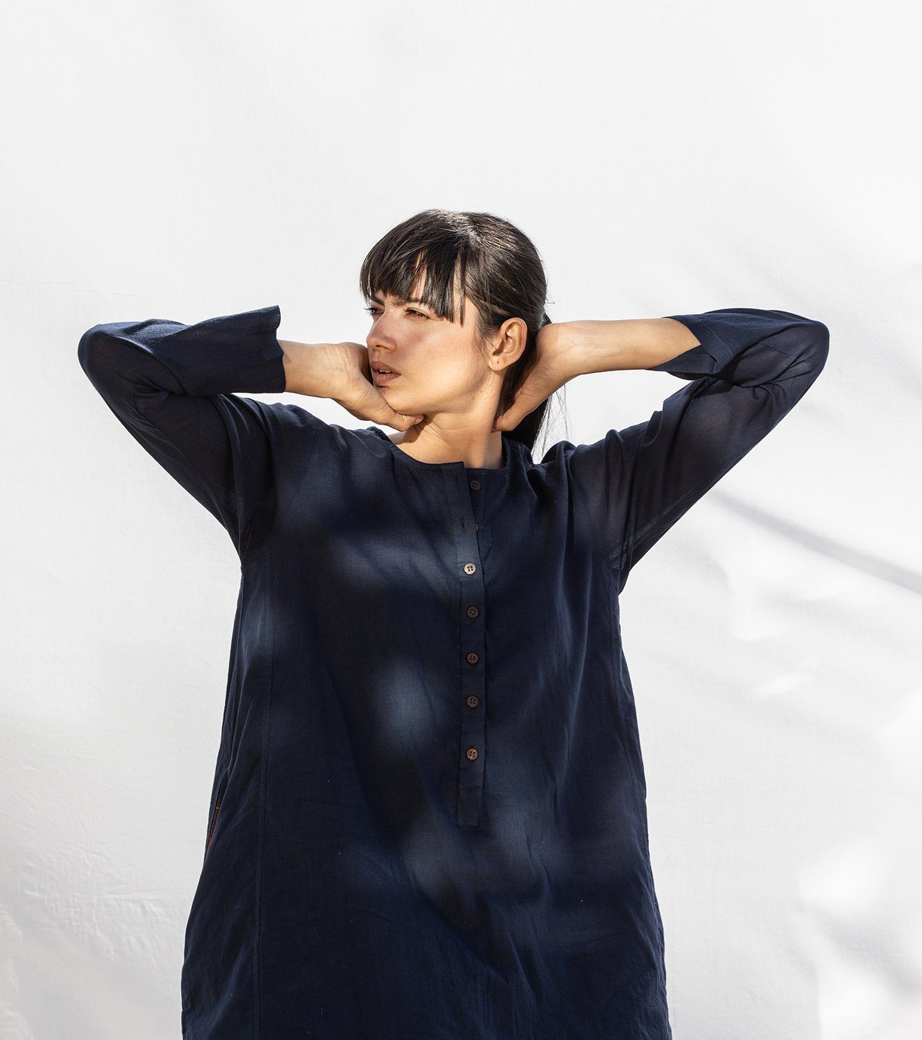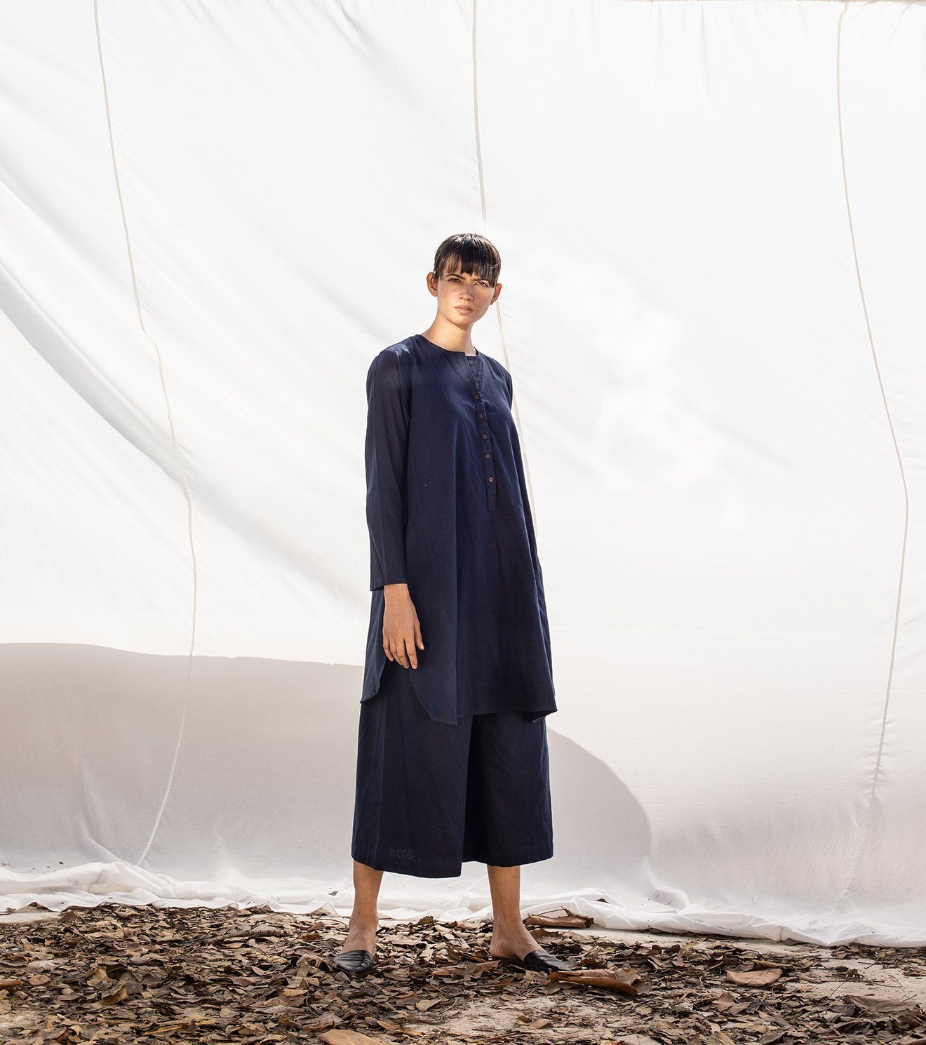 Navy kurta and culottes co-ord mulmul set. A-line kurta with a round neck, regular placket and full sleeves. Paired with cropped flared culottes.