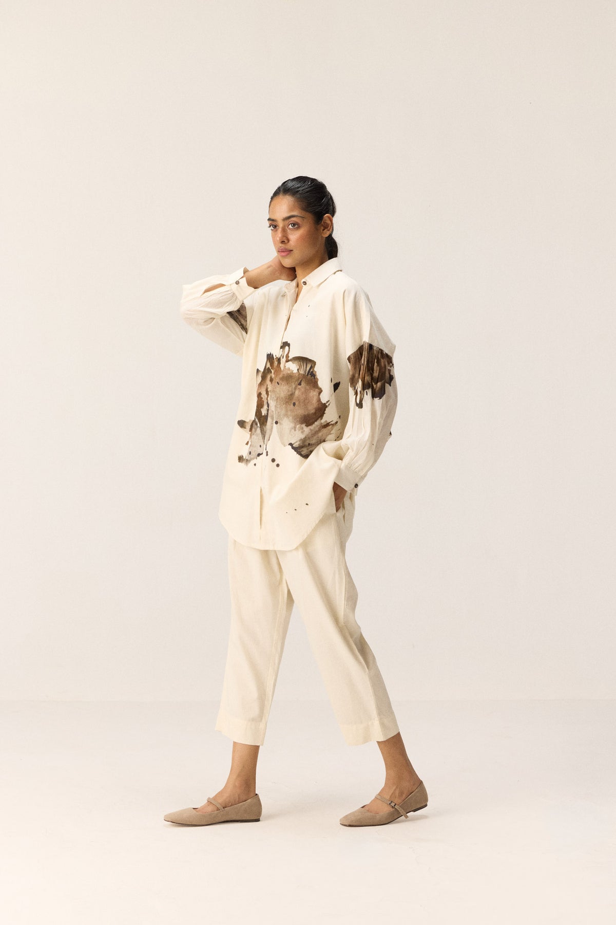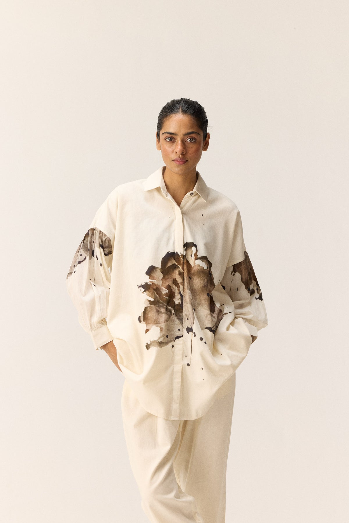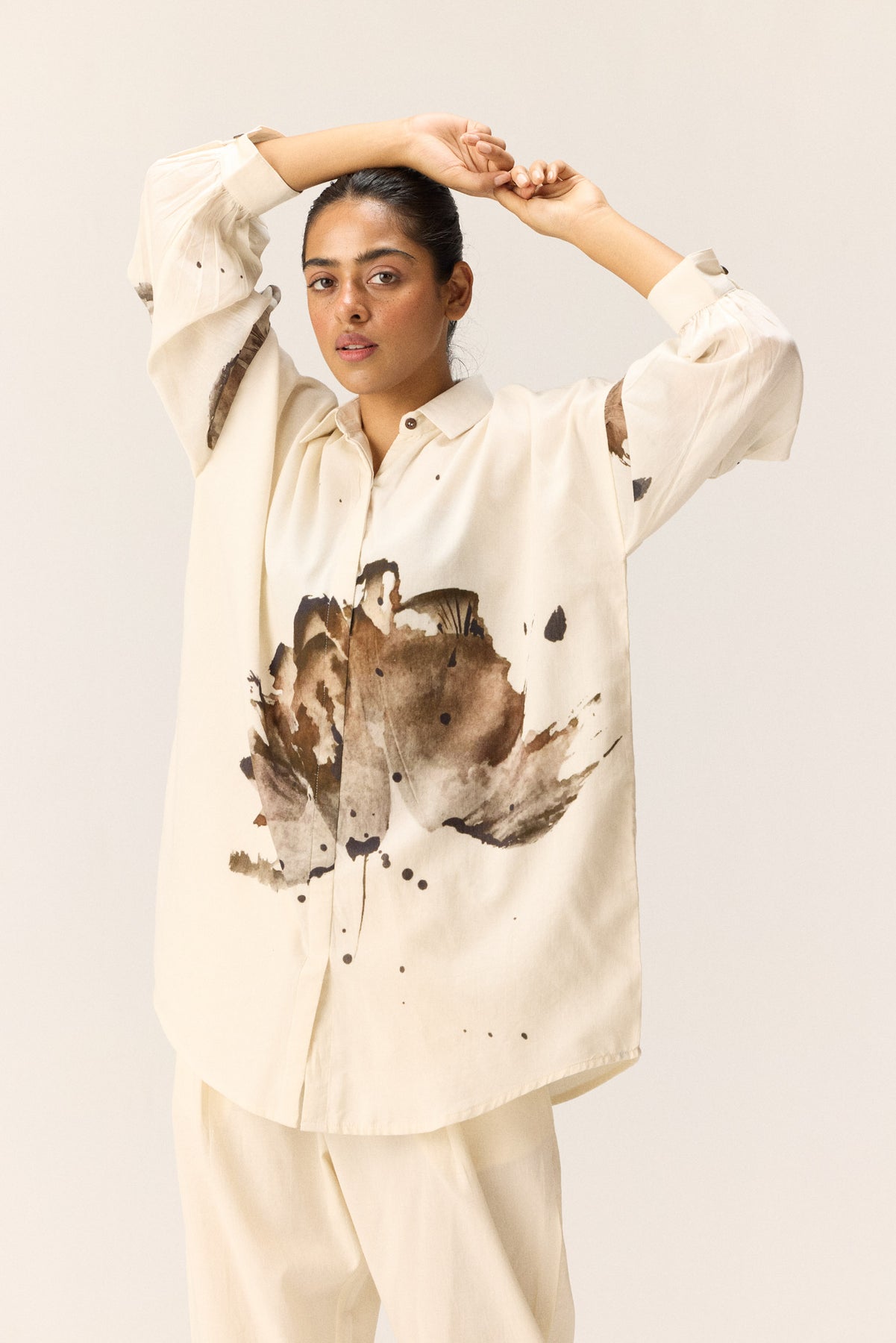 An off-white co-ord set featuring warm-toned floral motifs on the front and sleeves of the top. Designed with lapel collars and two front buttons, the set is paired with matching off-white pants that feature a front button opening, elasticated back, and side seam pockets.