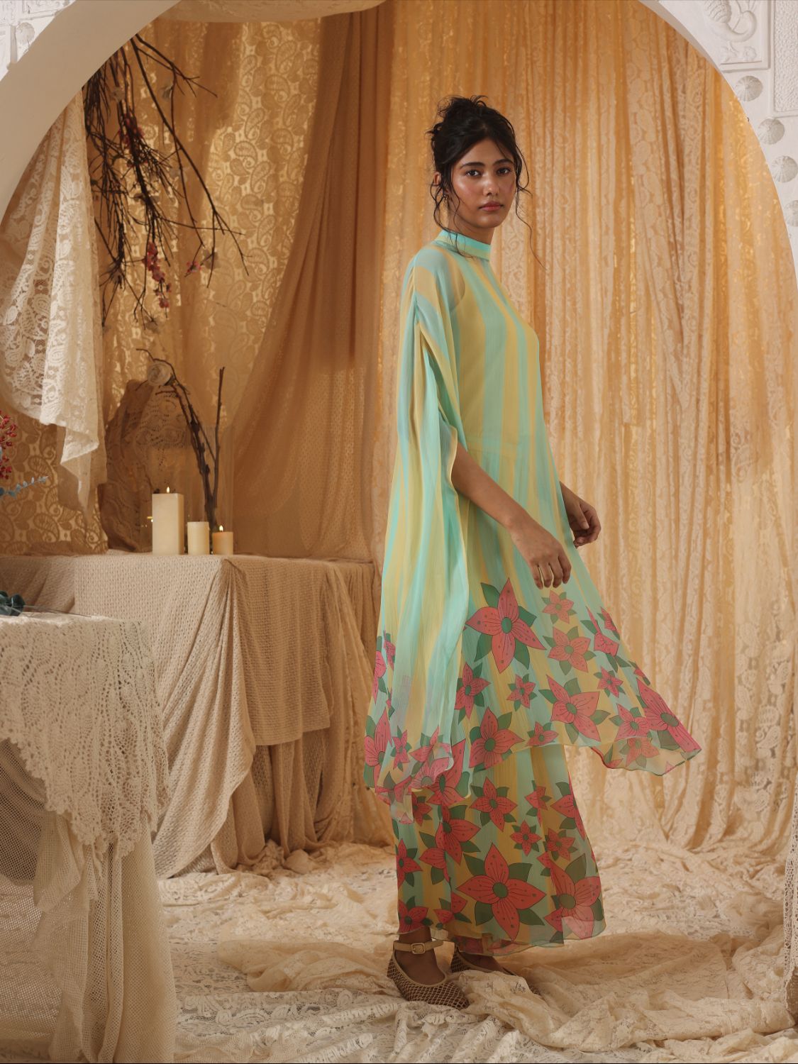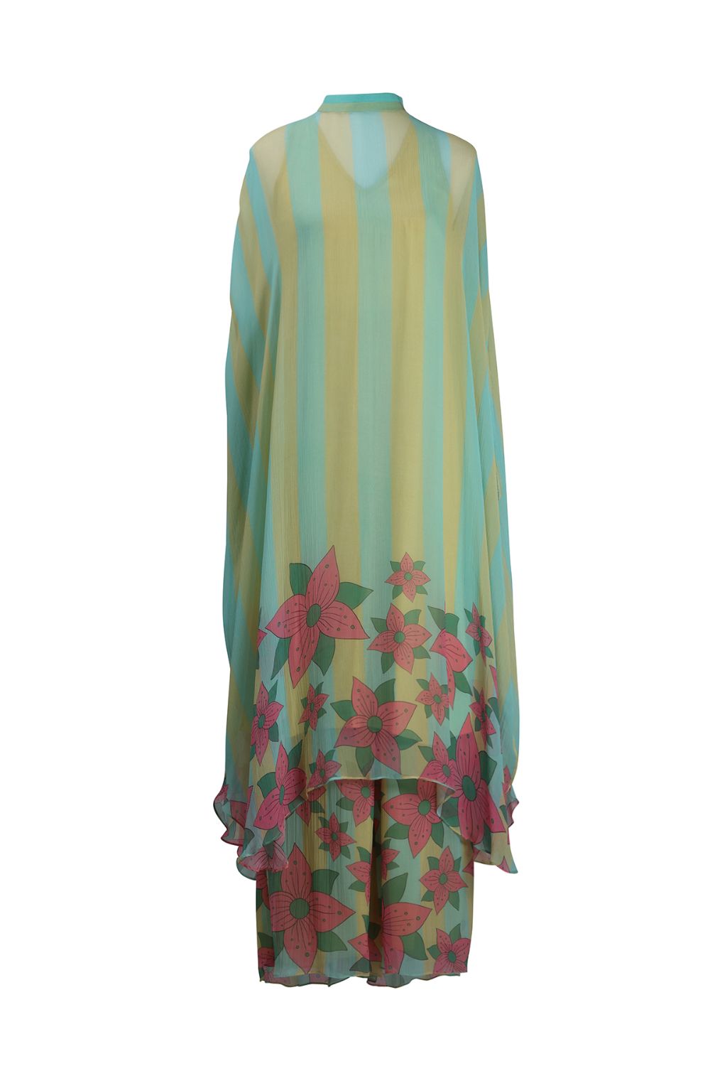 Breezy, billowy, and bursting with personality—this chiffon set is your statement summer ensemble. The batwing top features a soft yellow-blue stripe base with pretty pink floral prints and comes with a comfortable inner. Paired with relaxed-fit chiffon pants in a matching print, the set flows with you, perfect for destination dinners or relaxed resort mornings. Airy, chic, and full of vacation spirit, this set celebrates freedom in both form and function.