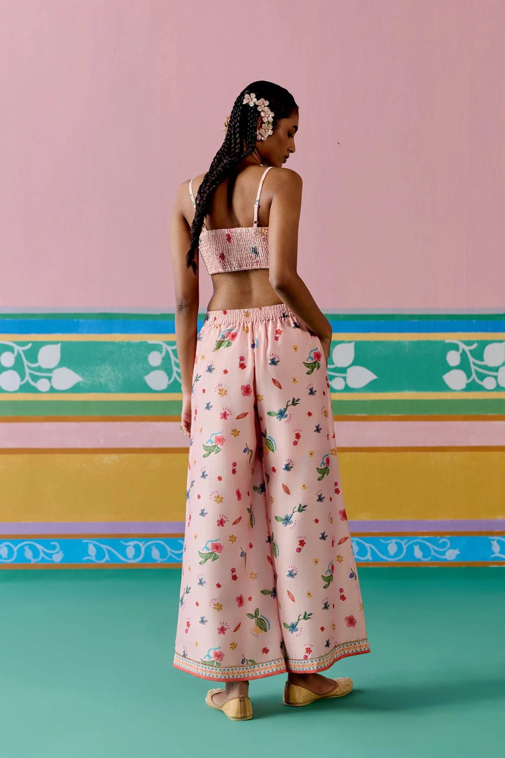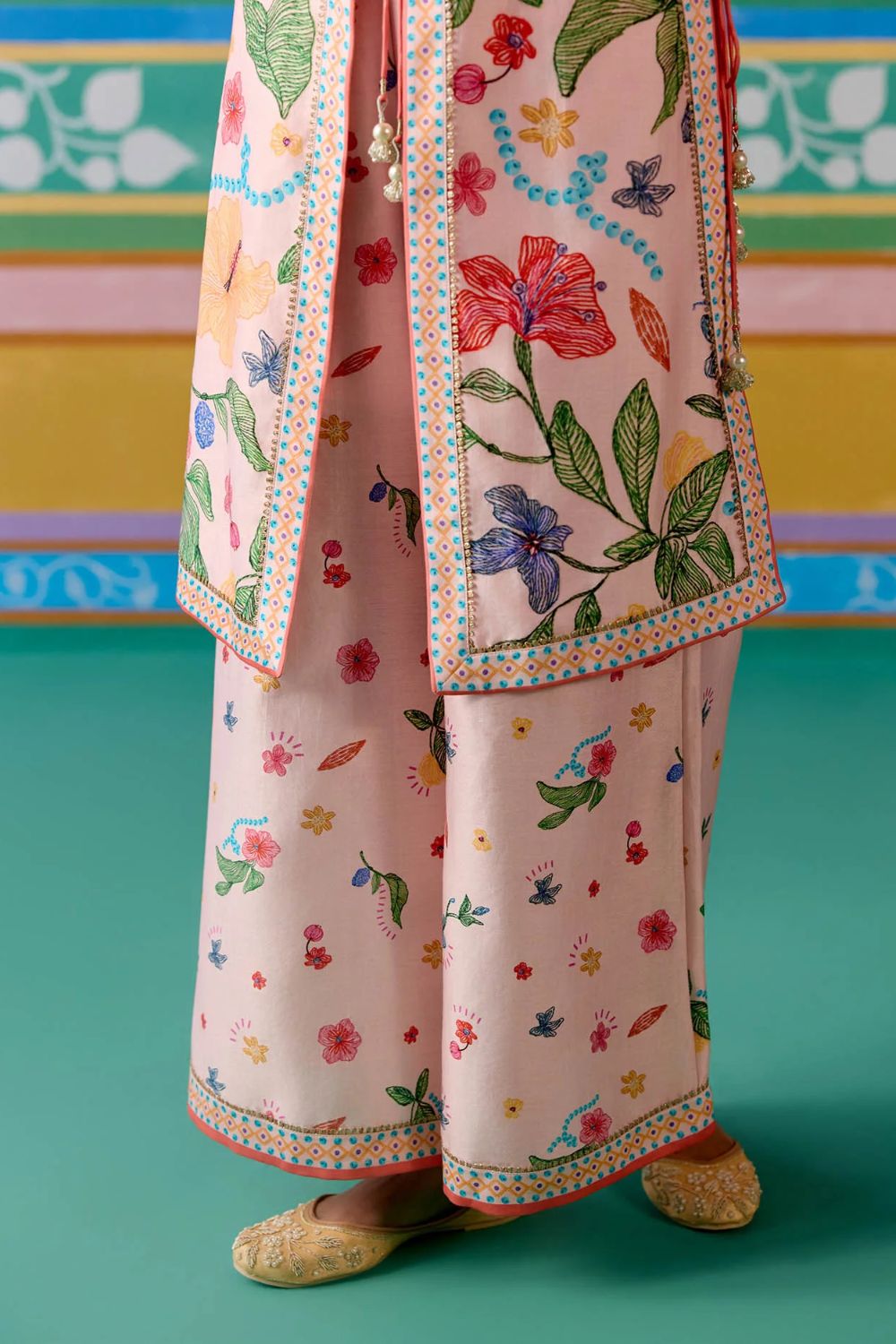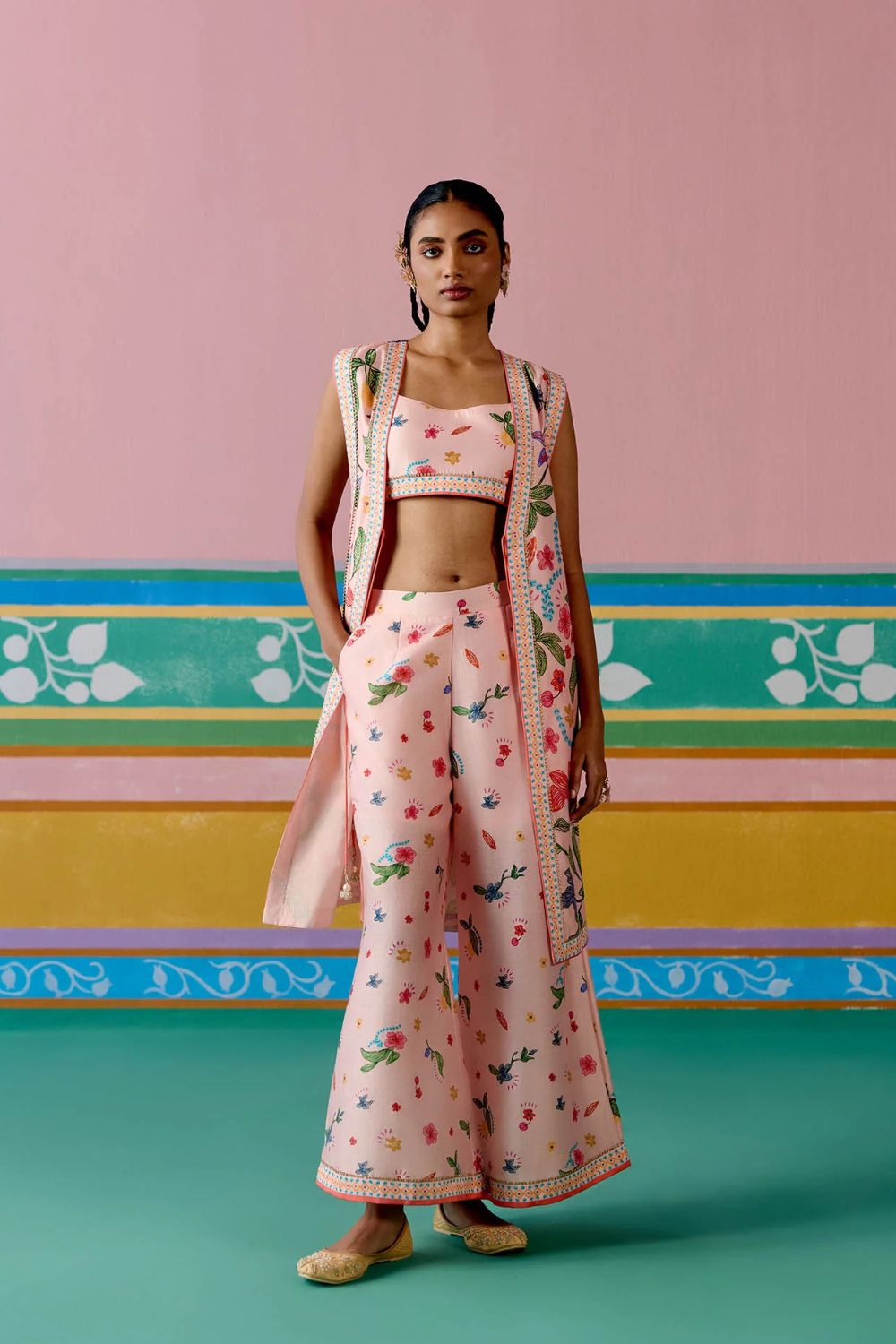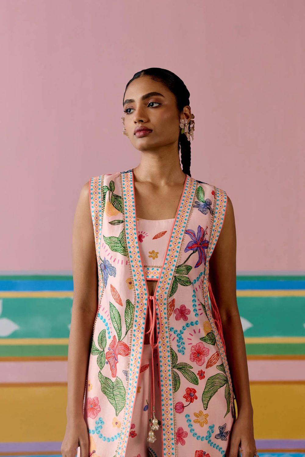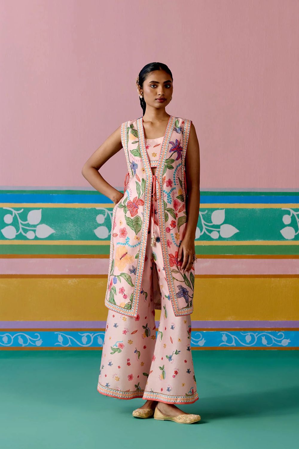 Chic and contemporary, the Dusty Pink Floral Jacket Set is crafted in airy Chanderi for a statement festive look. The sleeveless jacket is finished with a full lace border and playful dori tie-up details on the front and sides, accentuated with tassels for added charm. Paired with a bralette featuring a comfortable smocked back and pants with an elasticated waist, this versatile set blends ease with elegance—perfect for celebrations that call for a modern twist on tradition.