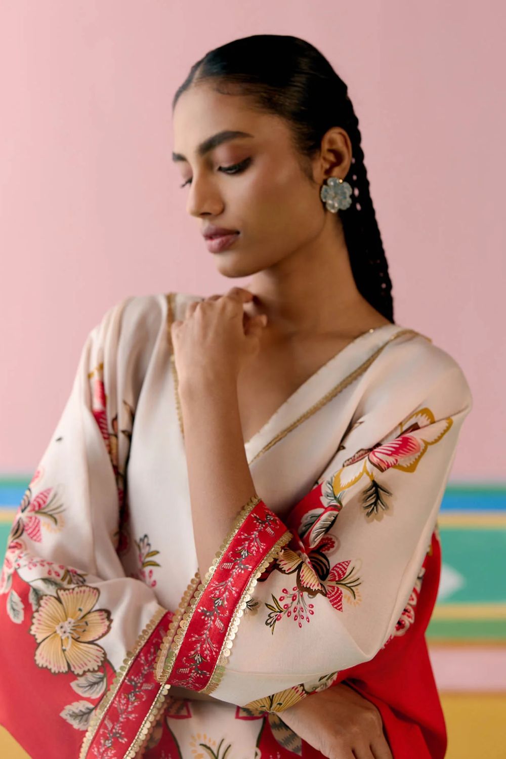 Light and graceful, the Ecru & Red Floral Kaftan Set is crafted in soft Chanderi for a breezy festive feel. The kaftan is adorned with lace detailing on the neckline and sleeves, while intricate hand embroidery at the bottom hem adds a touch of artisanal charm. Paired with pants featuring an elasticated back for effortless comfort, this set is an elegant balance of ease and sophistication—perfect for festive days that call for understated style.