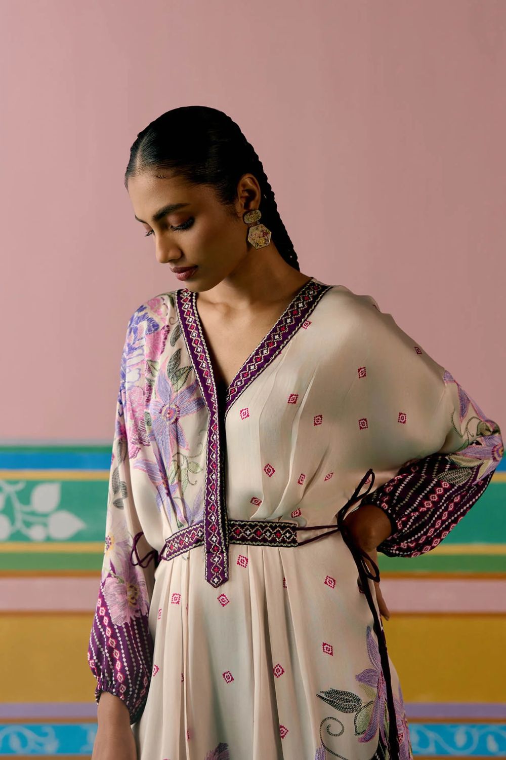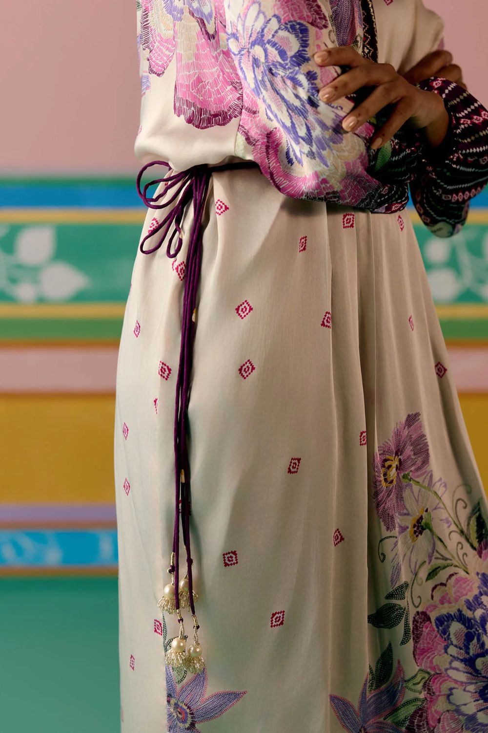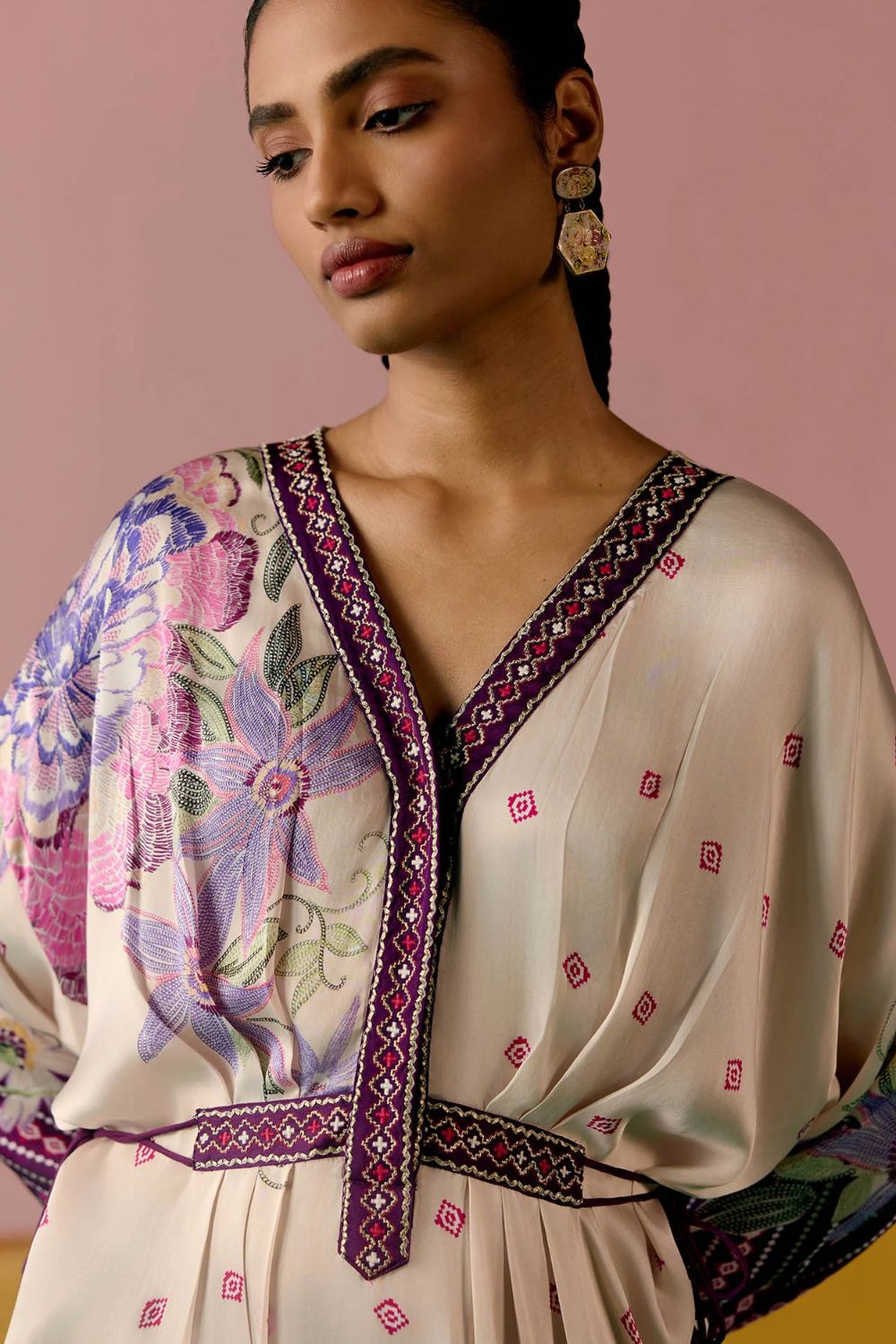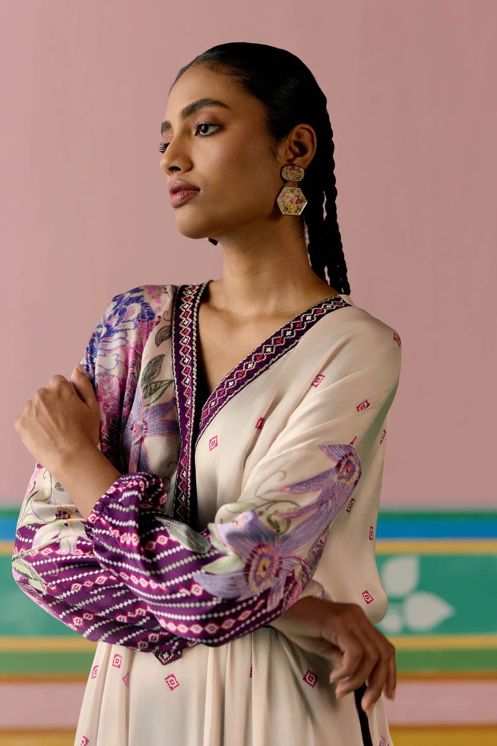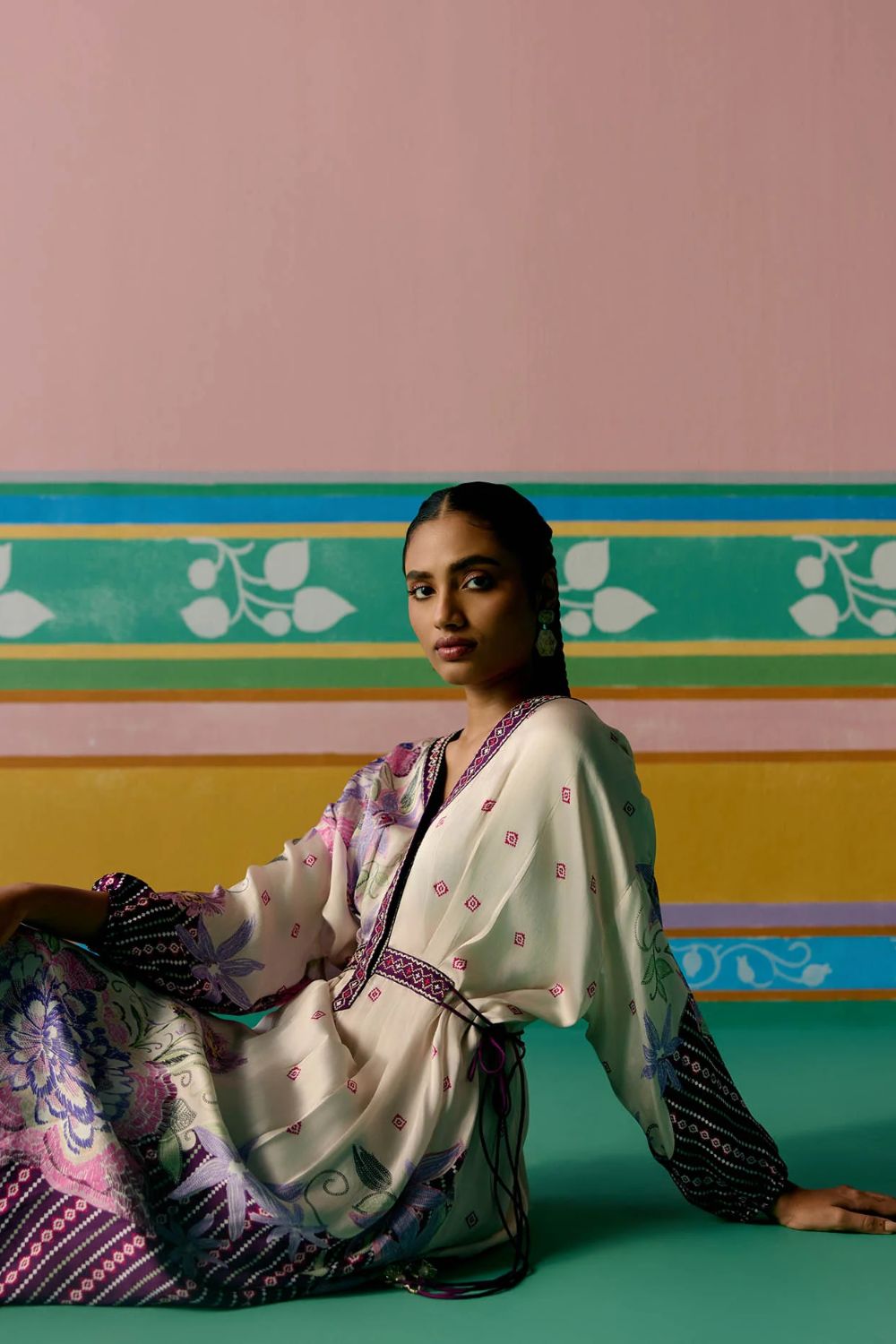 Effortlessly elegant, the Purple Ikkat Kaftan Set is crafted in fluid Viscose Satin Georgette for a luxe festive feel. The kaftan is highlighted with intricate hand-embroidered gota patti work on the neckline and waistband, bringing a touch of traditional artistry to the silhouette. Dori tie-up details with tassels on the sides add playful movement, while the elasticated sleeves and pants with an elasticated back ensure comfort without compromising on style. A perfect balance of ease and grandeur, this set is made to shine at every celebration.