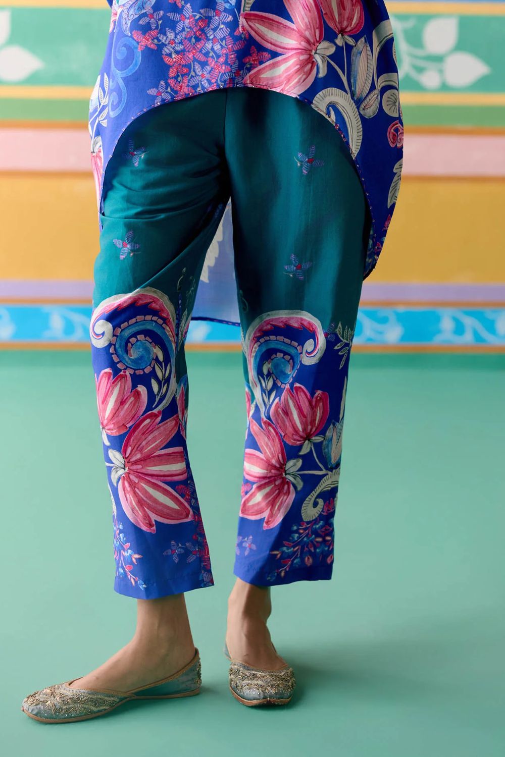 Fresh and festive, the Teal Paisley Kaftan Set is crafted in airy Chanderi for a light and graceful appeal. The kaftan features delicate lace detailing on the neckline, playful tassels on the sleeves, and intricate hand embroidery along the bottom hem for a touch of artistry. Paired with pants designed with an elasticated back for ease and comfort, this set is the perfect blend of relaxed elegance and festive charm.