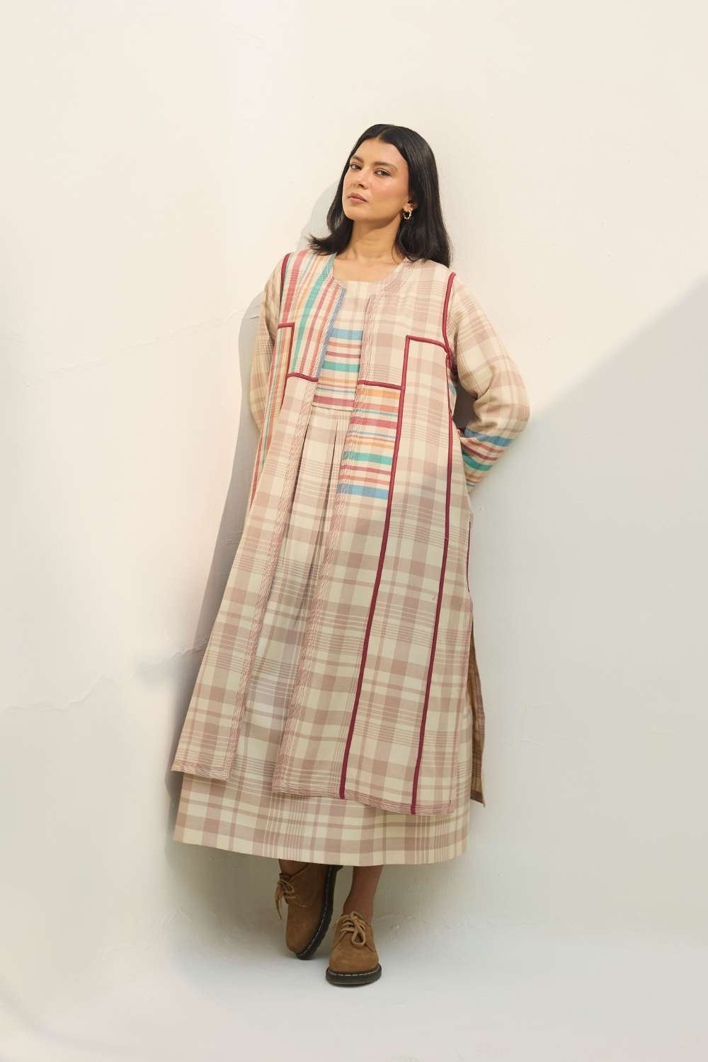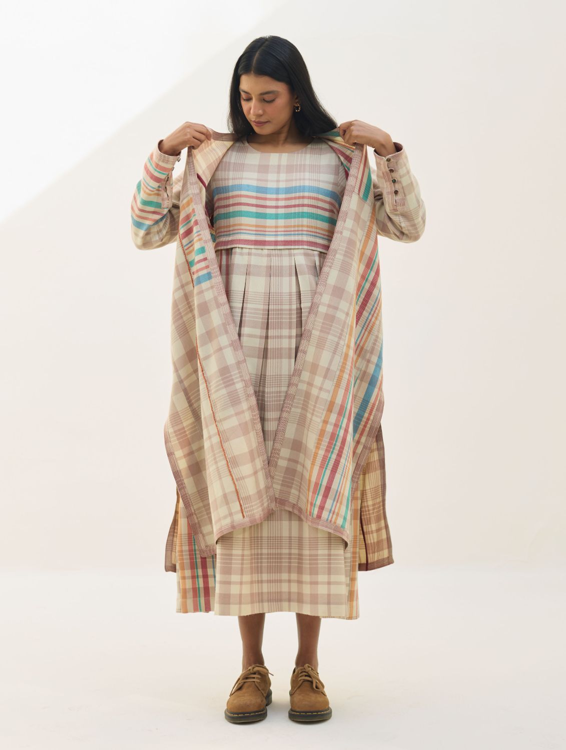 Overlay- This Thena reversible overlay is meticulously handcrafted in our yarn-dyed soft merino wool woven in a two-toned check with multi-coloured striped border. The overlay is designed by thoughtfully placing merino wool panels that create a striking visual rhythm along the bodice. Fully reversible, the Thena features contrast piping and clean pop-colour stitchlines along the placket, hemline, and sleeve hems—highlighting deliberate detailing on both sides. Hand-knotted decorative stitches add a textural and colourful accent to the design. Reversible pockets and natural statement buttons enhance functionality and finish, making this overlay a versatile layer that can be paired with multiple outfits for a fresh, contemporary look that is warm and timeless.