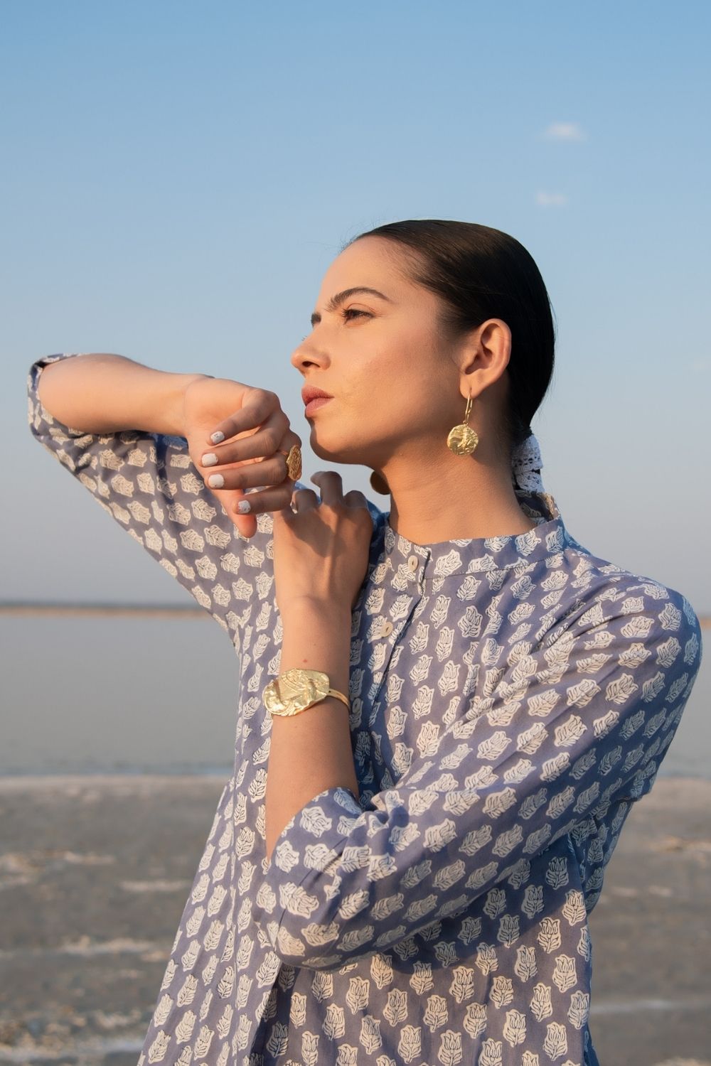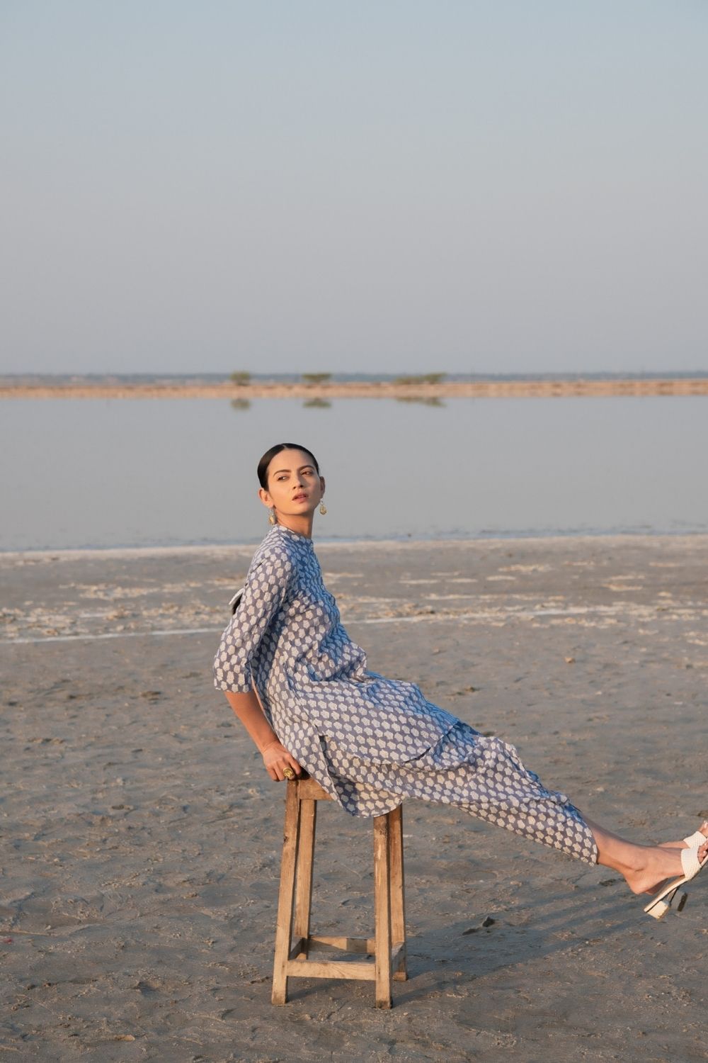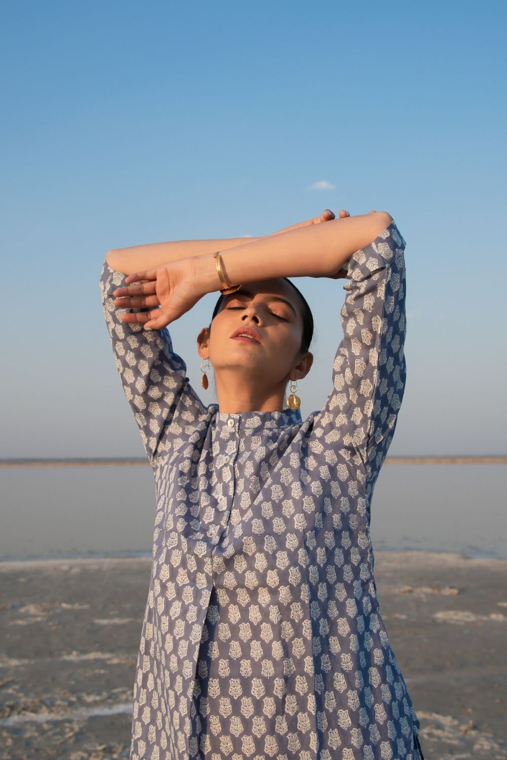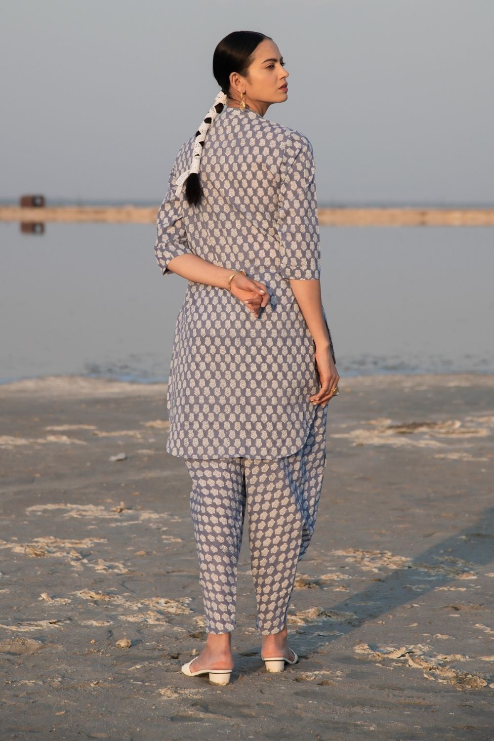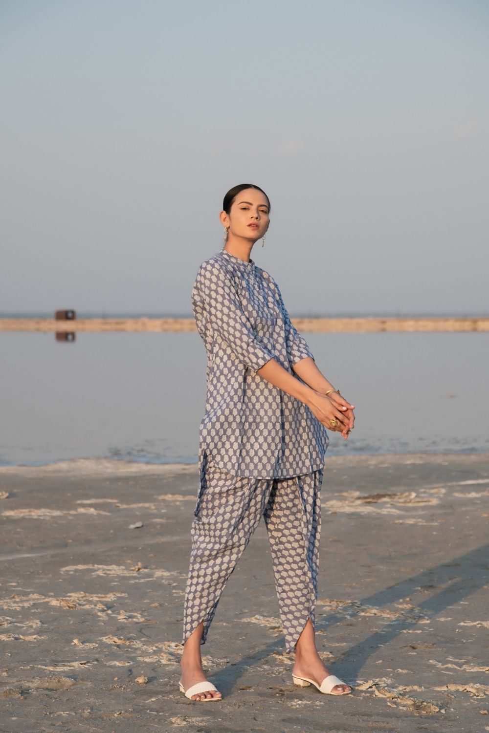 Assymetrical kurta combined with draped dhoti (Indian harram) style Co-ords are a must have in any closet. This set comes with an assymetrical kurta with sleeves and a simple collar. Handblock printed in a blue lotus design on soft cotton. Comes with a draped dhoti botton like the classic Indian harram pant style.