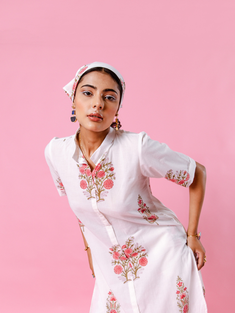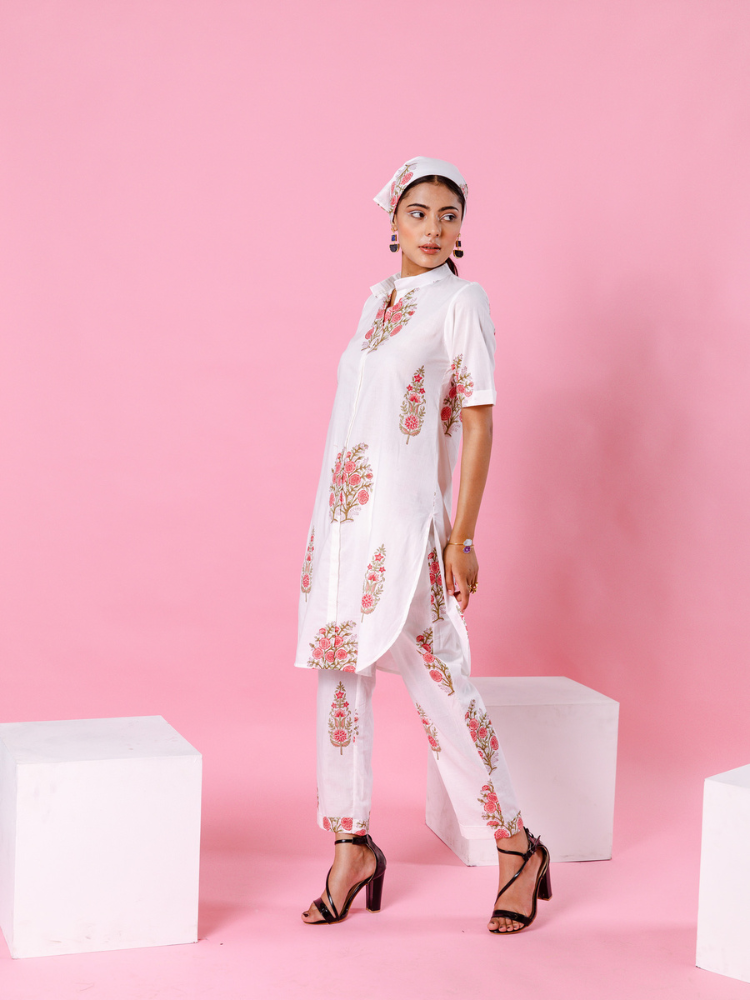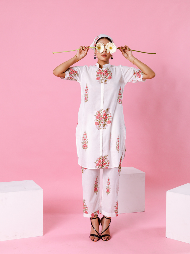 Delilah - Bright like the summer sun and beautiful like the first dawn of spring. Our forever essential co-ords for made for balmy summer. Florals on ivory remind us of English summers. This set consists of a hand-block printed tunic paired with matching trousers,