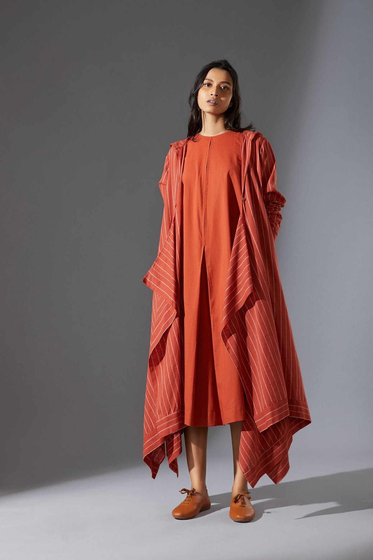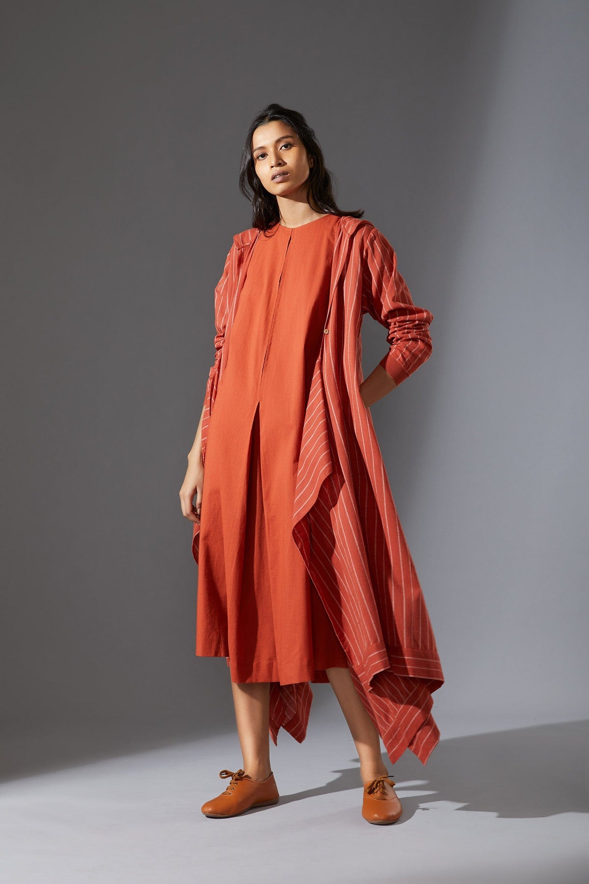 An interesting and modern take on a stripe shirt. With a simple placket in front and elastic on the sleeves it gives a chic look from the front. From the side it surprises with intricate pleated shoulders and makes a statement. Team it up with our stripe pants and sport it as a set. This set comes with a dress and jacket.