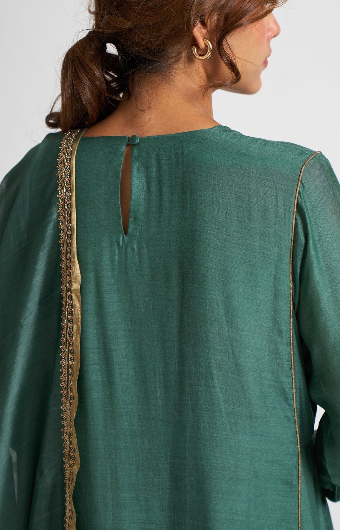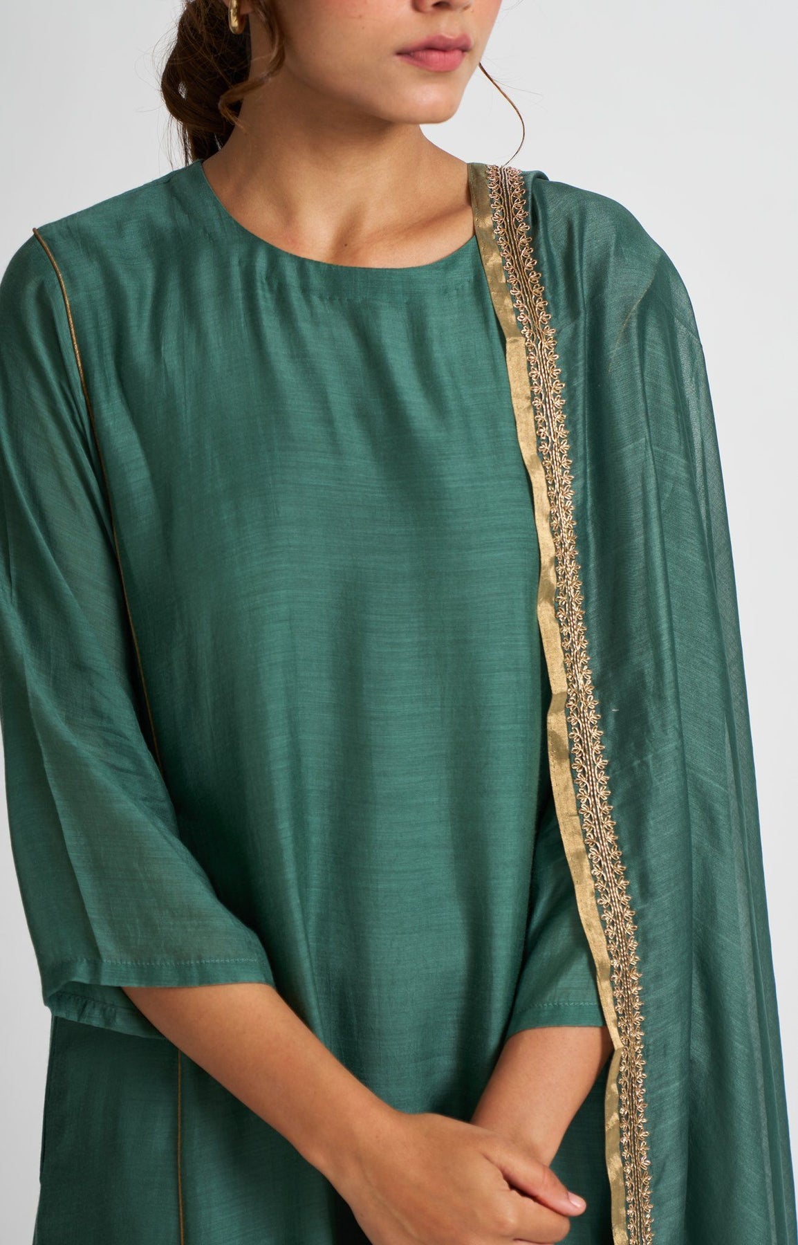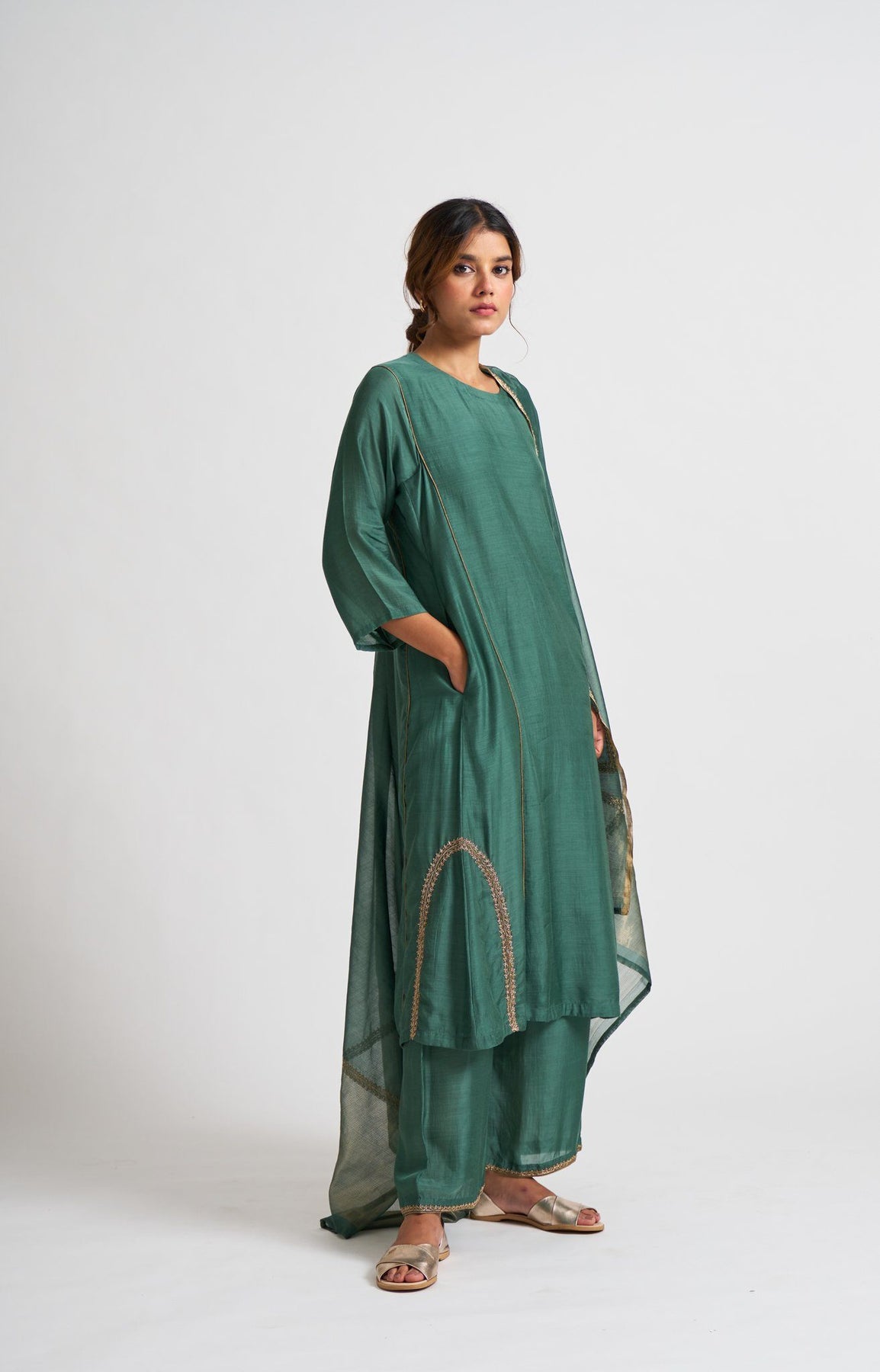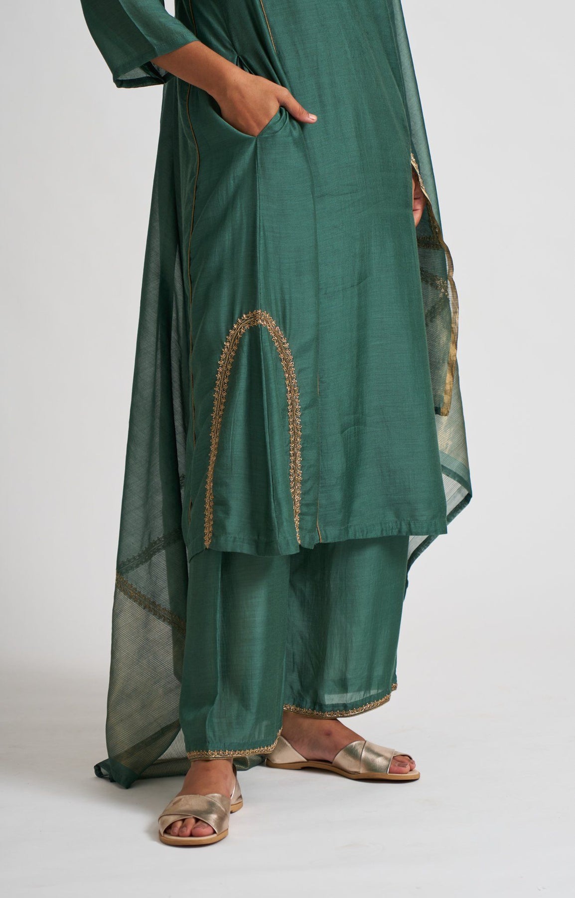 It's a three-piece garment made in cotton silk and chanderi. Colored in a deep emotive shade of teal. The asymmetric A-line cut of the kurta is embellished with gold dabka borders, complimenting the sensuality of red with the straight broad fit of the pants in cotton silk.