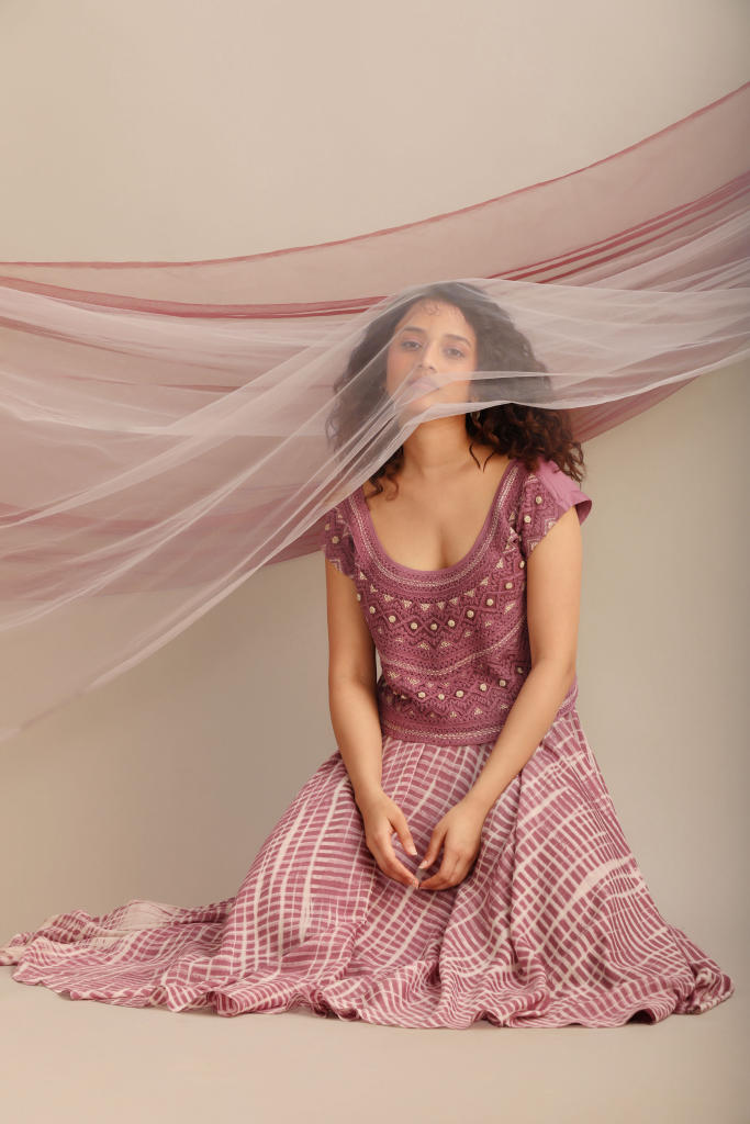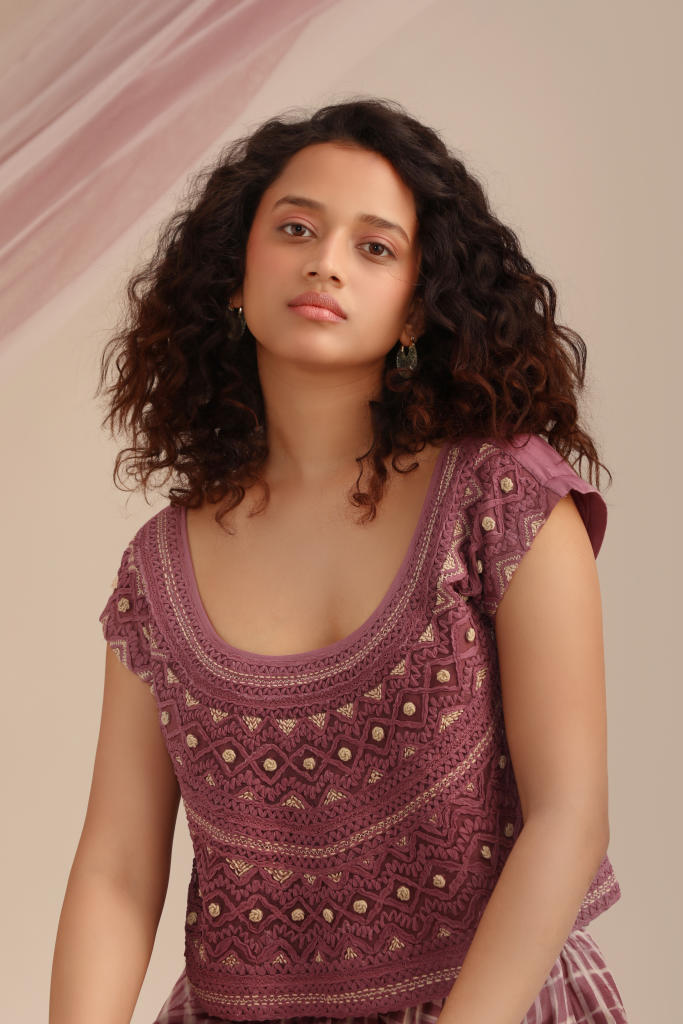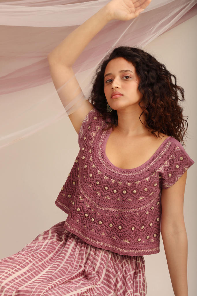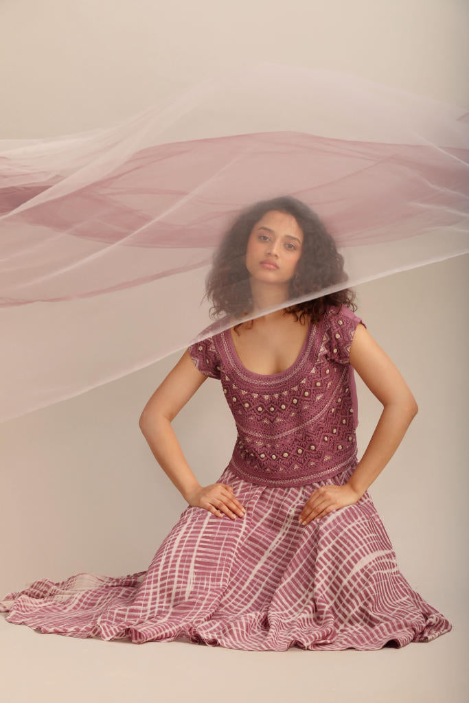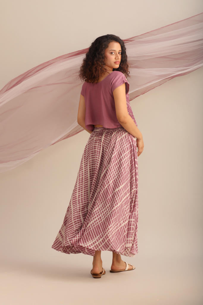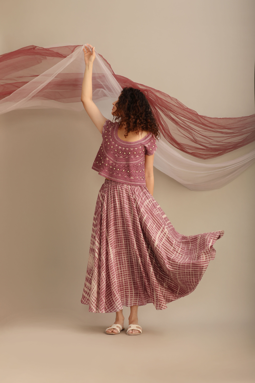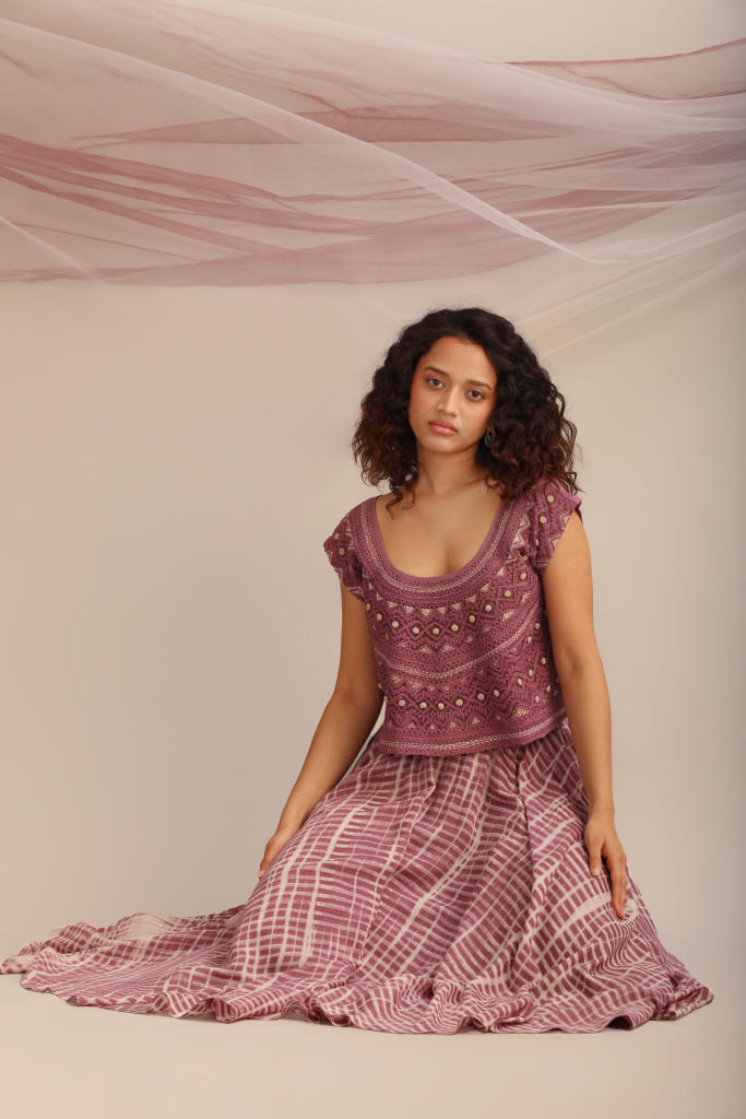 A lavender two pieced set with a chiffon cording embroidery on crop top and a printed circular skirt