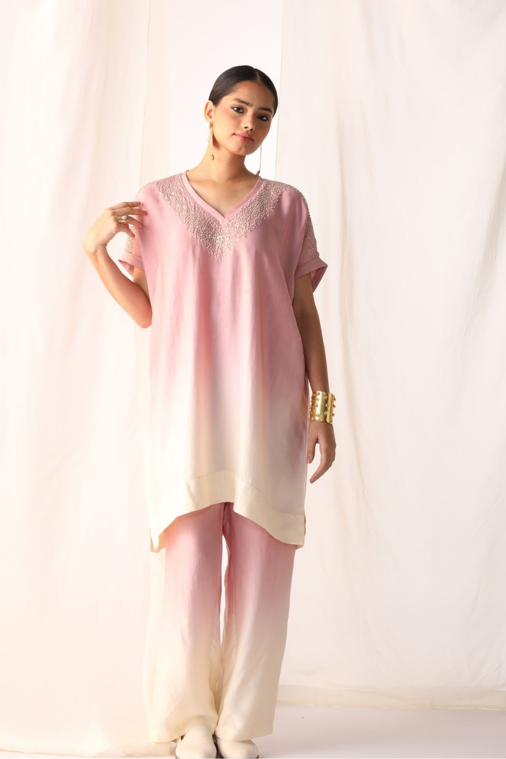 Make a statement this summer with our breezy Linen satin ombre dyed Cord Set in soft pink and off-white, adorned with delicate french knot embroidery on neck and shoulder.