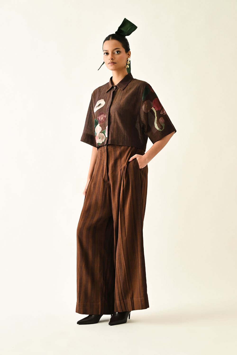 Top: Anti-Fit cropped shirt, hand-painted abstract expressionist digitally transferred print, with back yoke and box pleat. Print placements will vary—single Piece. Model is wearing - XS/S