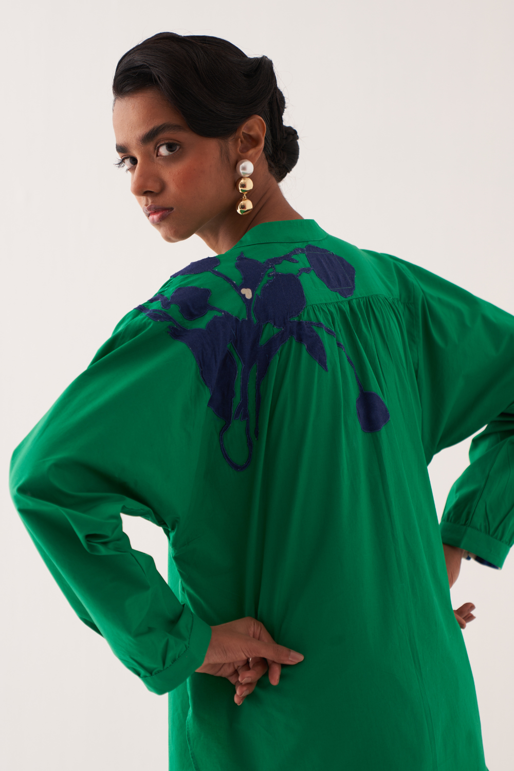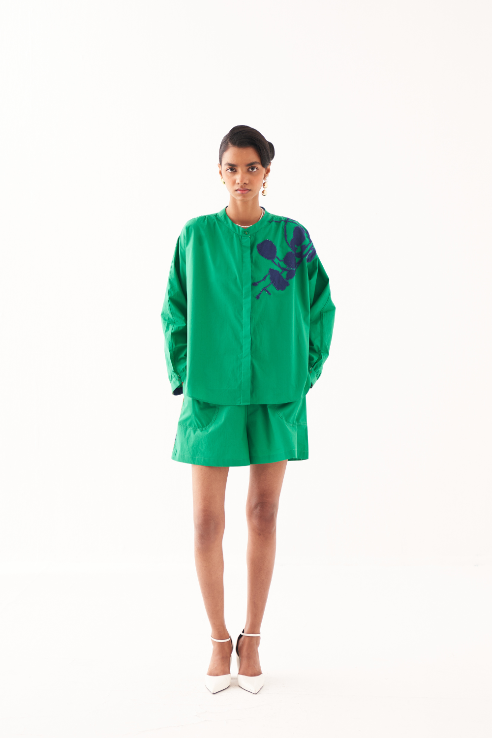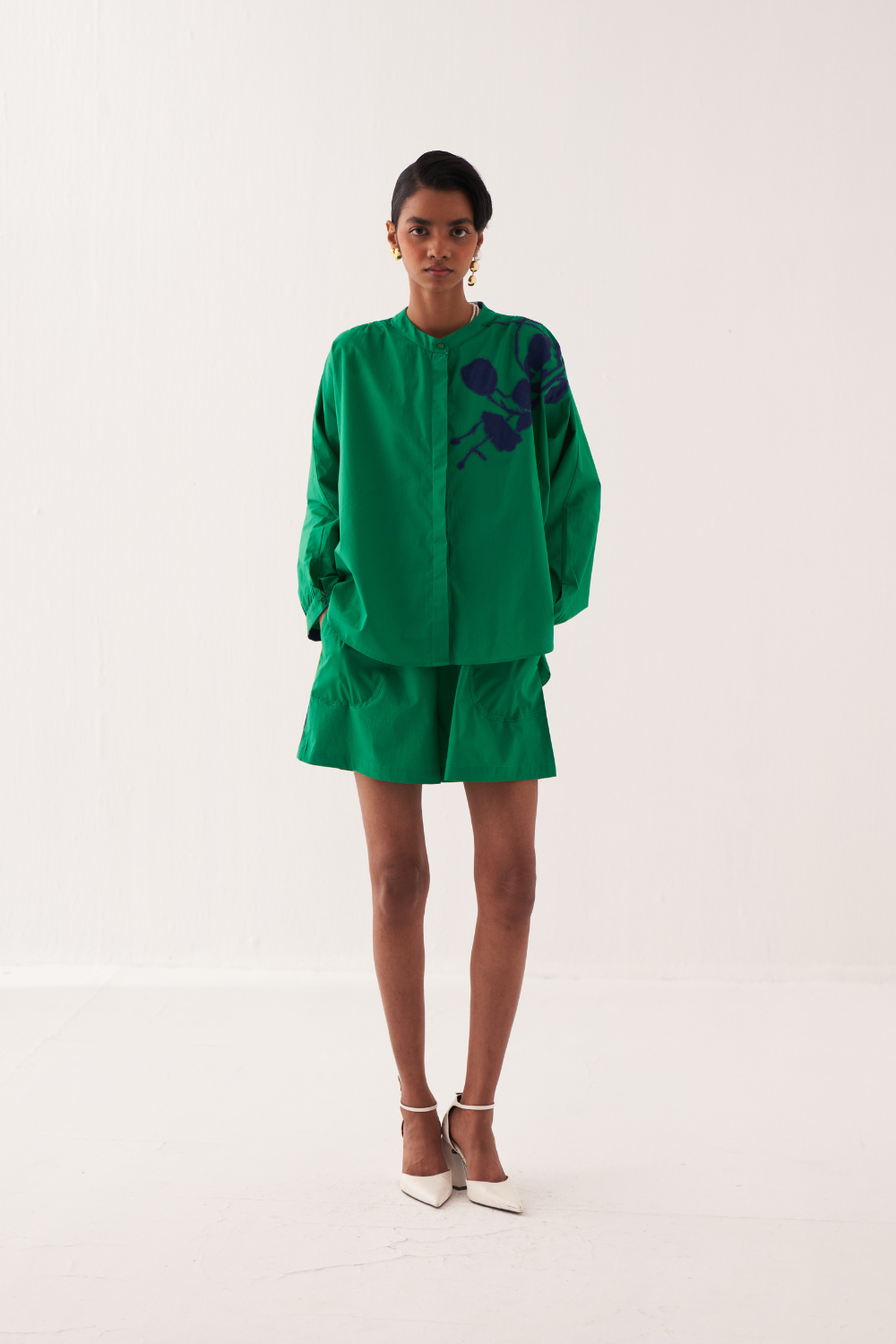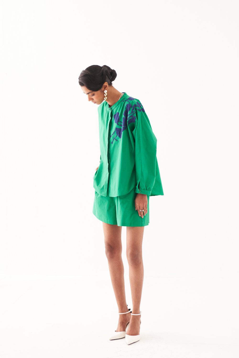 The RJ shirt has single thread embroidery on floral applique on the shoulder features gathered neck, with side slits and a front button placket. Hand-embroidered Signature OFR Lune adds a unique touch. print placements will vary. Model is wearing size M.