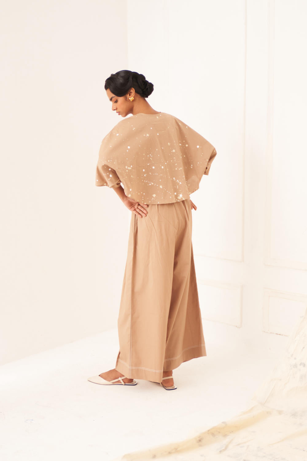 Top: One-size top featuring a round hem, Hand splatter paint, and a subtle slit pocket for added functionality. Finished with our signature sun embroidery detailing on sleeve.
