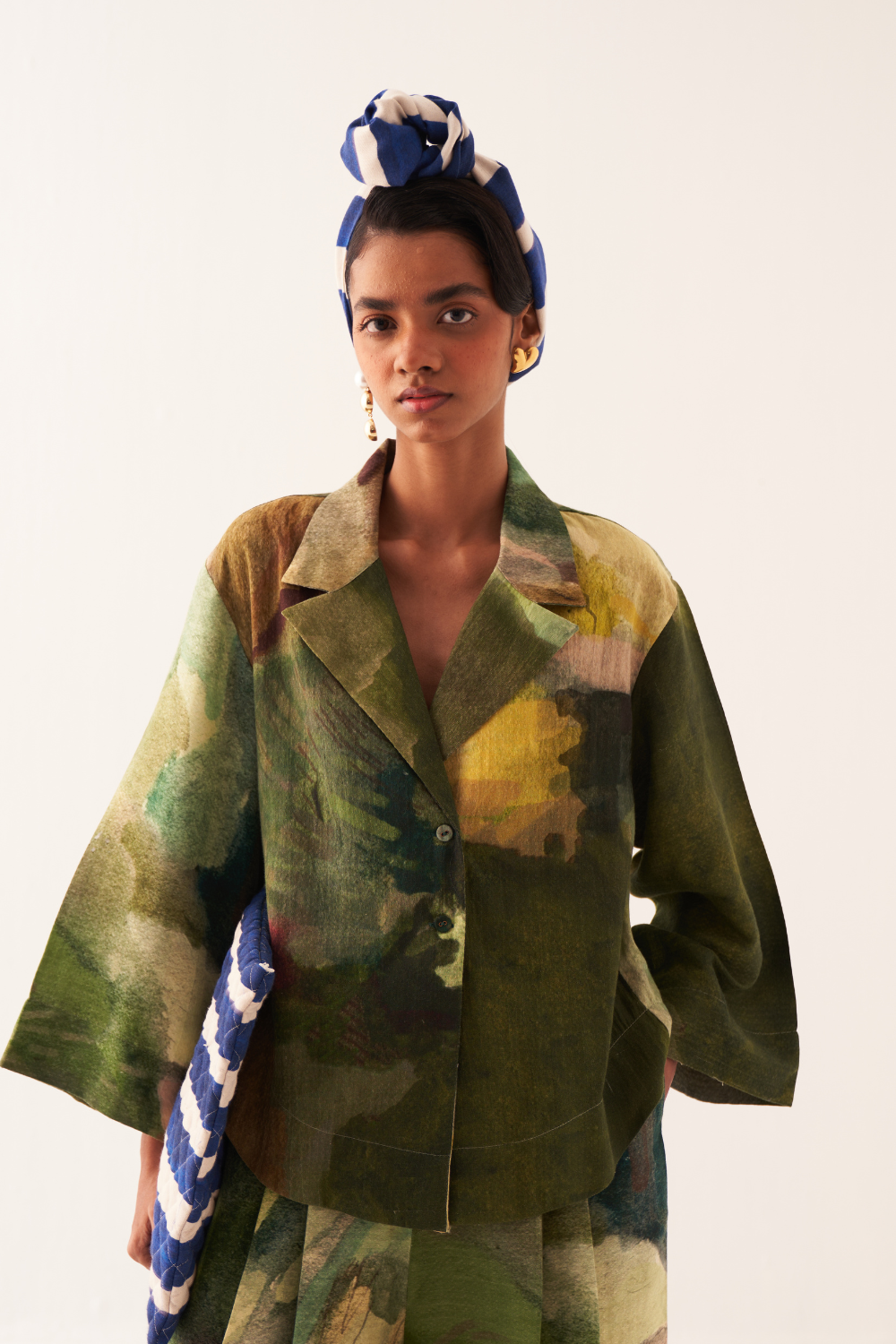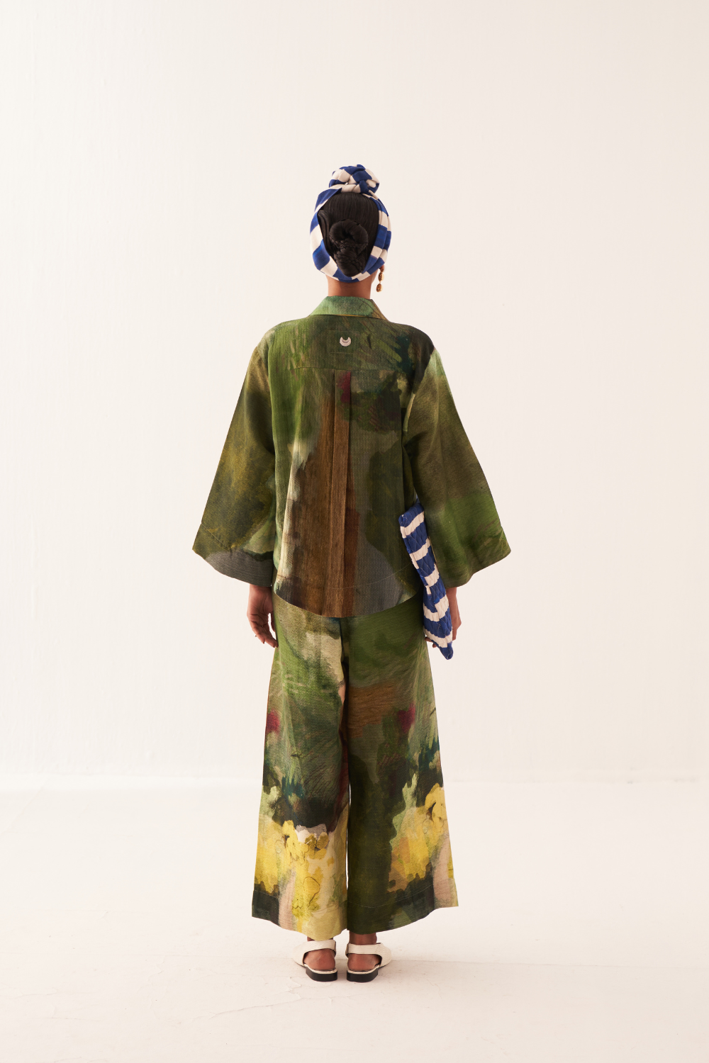 Anti-fit jacket shirt is hand-painted abstract expressionist print, digitally transferred. The shirt features a lapel collar, Kimono sleeves. Signature OFR lune embroidery at back. Print placements will vary—single piece. Model is wearing - M