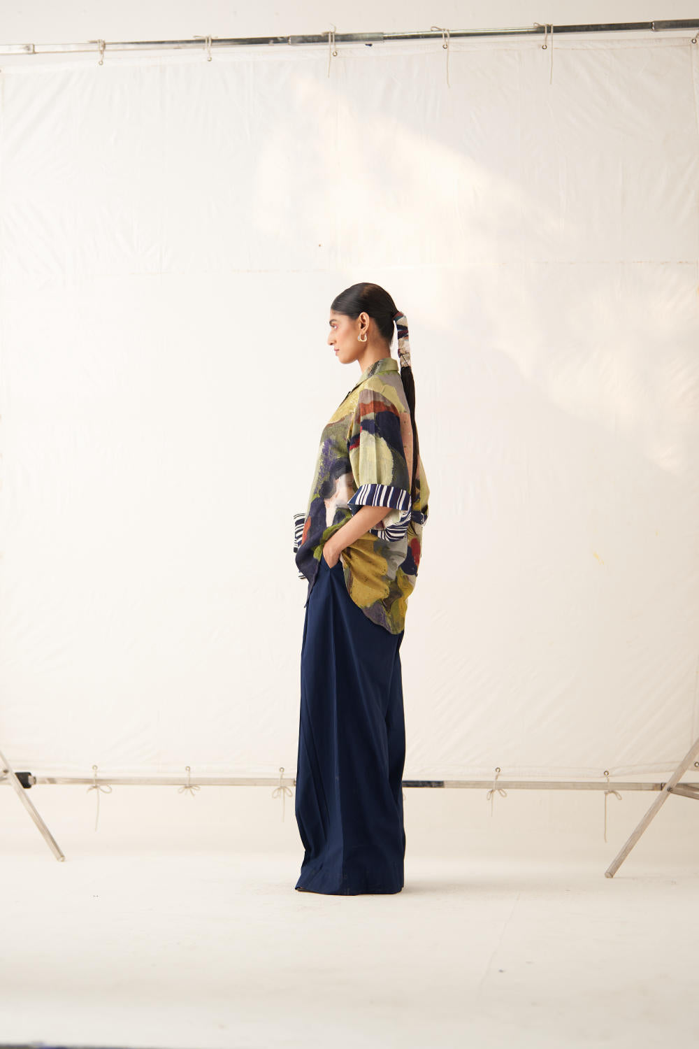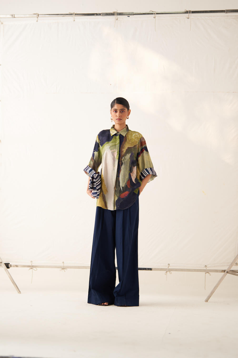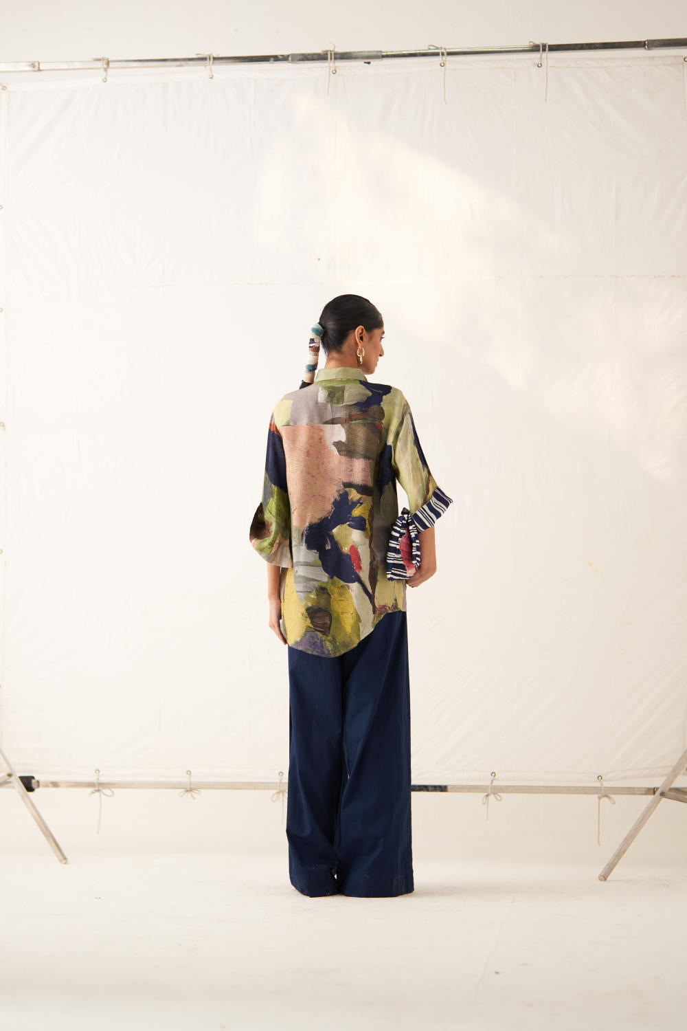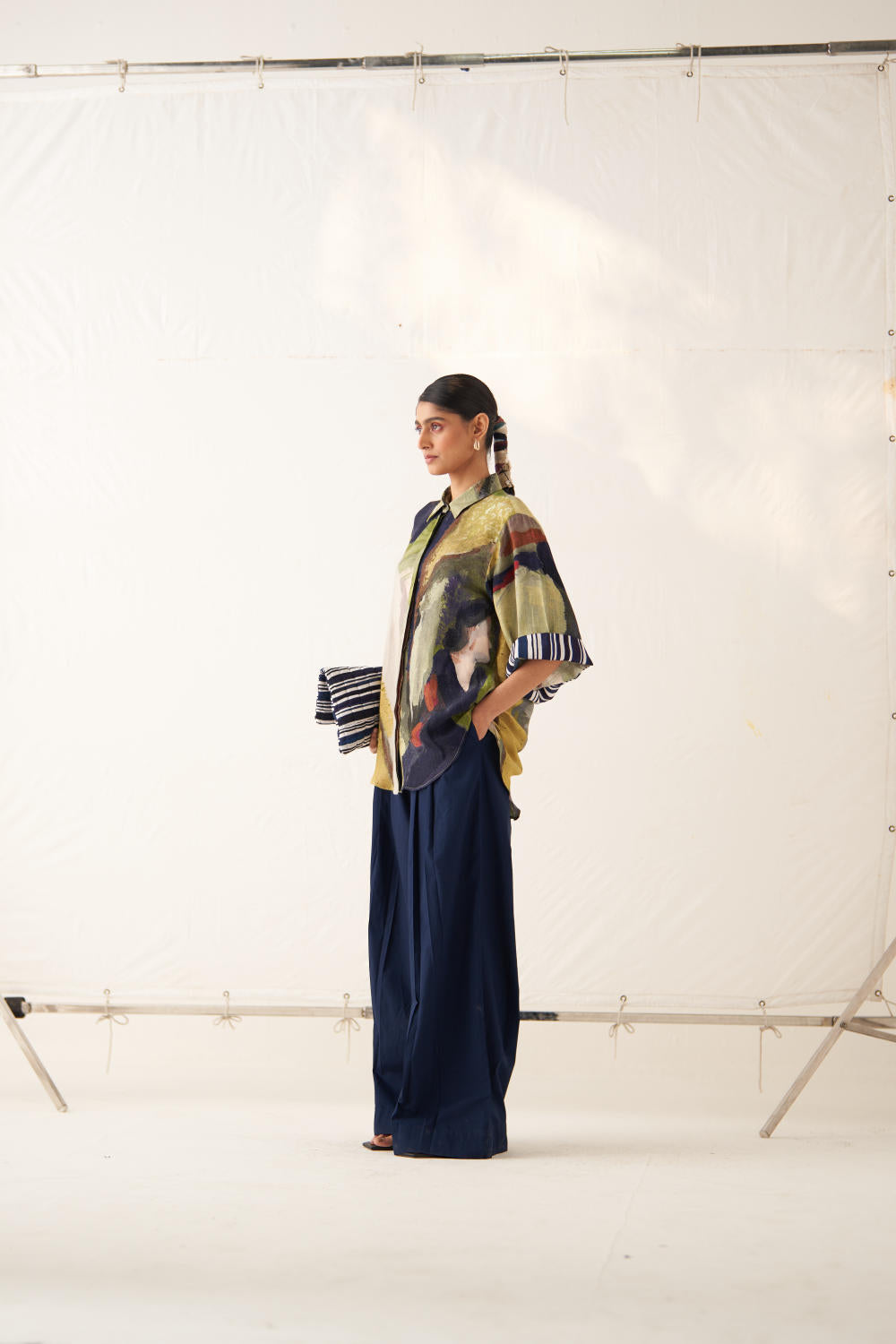 Top: GOT Certified Azo-free dyes, Anti-Fit, Hand-painted abstract expressionist digitally transferred print, Shirt collar, Front concealed placket, Rollup sleeves, Round high-low hem, Back yoke, and Hand-embossed vintage Indian coin detail at back. Garment length is 29".