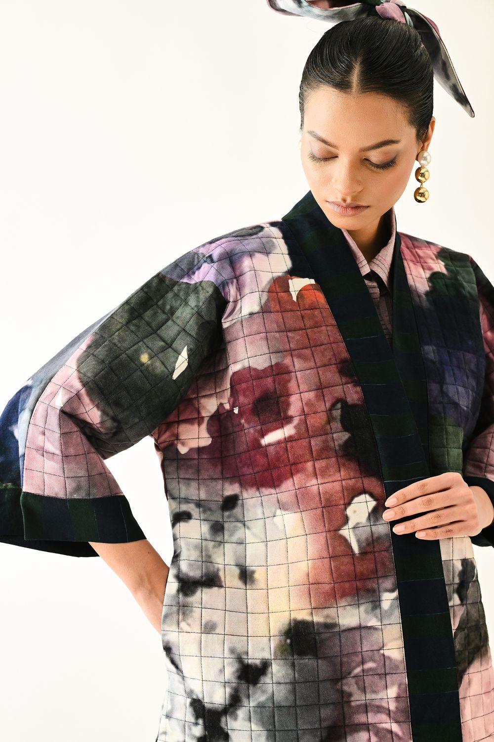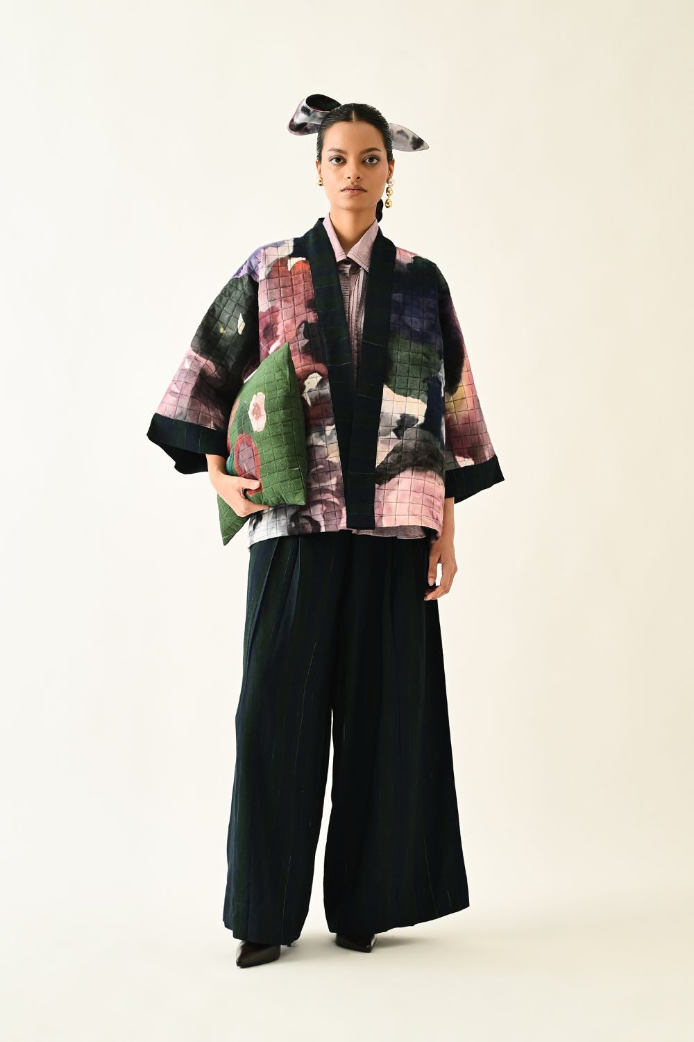 Jacket: A handcrafted quilted jacket featuring a vibrant floral hand-painted pattern on a textured grid base. Designed with a relaxed, open-front silhouette and a contrasting striped lapel.